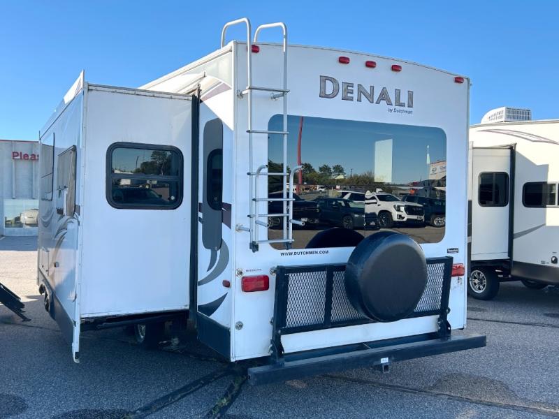 Dutchmen Denali Fifth Wheel w/Rear Living Area Including 2 Lounge Chairs w/Table Between & Overhead Cabinets, Air Mattress Sofa & Oversized U-Shaped Dinette Slide, Dbl. Kitchen Sink, 3 Burner Range w/Microwave, Refrigerator, Pantry, Corner Linen Cabinet, Step Up to Side Aisle Bath w/Angle Shower, Toilet & Sink, Front Queen Bed w/Wardrobe & Shirt Closet/Nightstand, Sliding Larger Wardrobe and Much More!