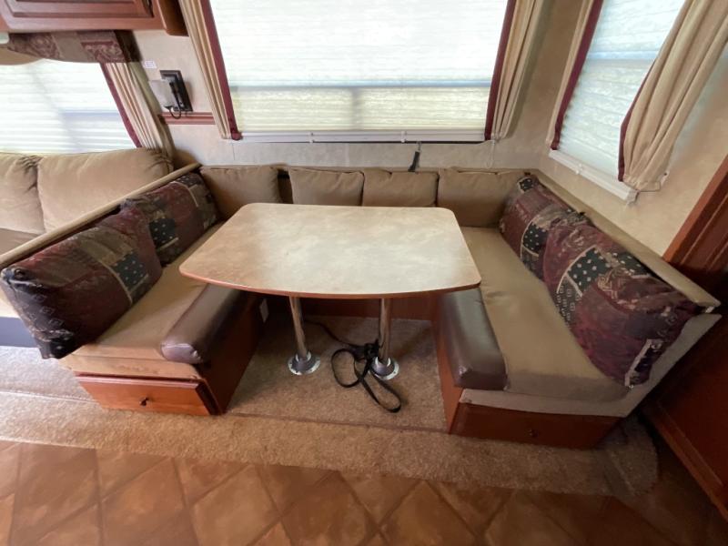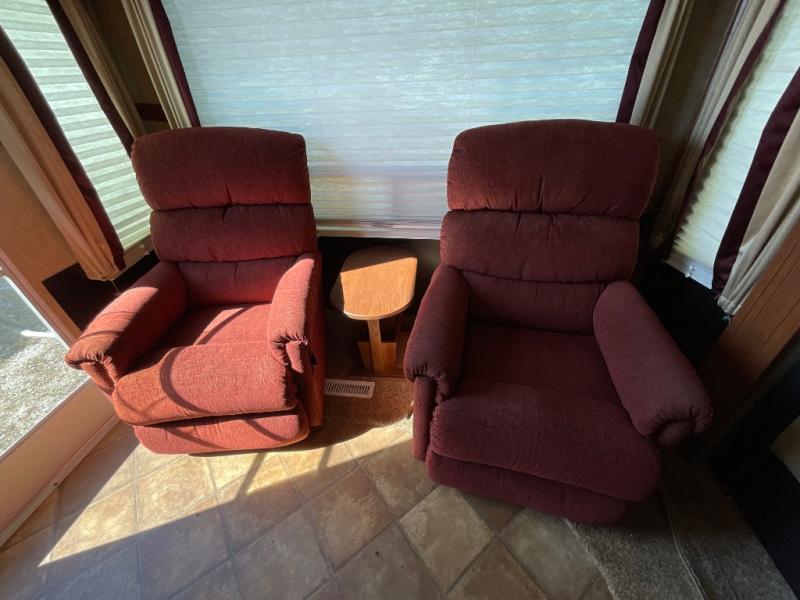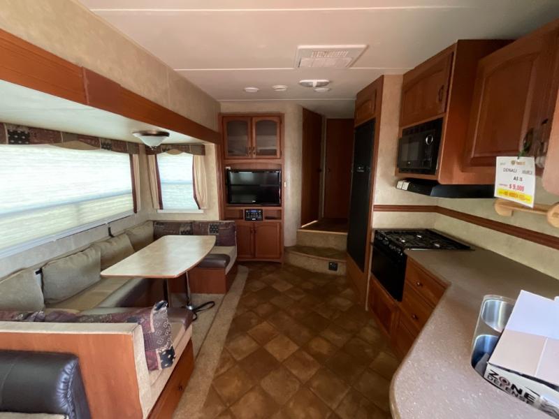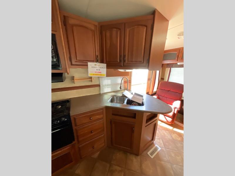 AS ISDutchmen Denali Fifth Wheel w/Rear Living Area Including 2 Lounge Chairs w/Table Between & Overhead Cabinets, Air Mattress Sofa & Oversized U-Shaped Dinette Slide, Dbl. Kitchen Sink, 3 Burner Range w/Microwave, Refrigerator, Pantry, Corner Linen Cabinet, Step Up to Side Aisle Bath w/Angle Shower, Toilet & Sink, Front Queen Bed w/Wardrobe & Shirt Closet/Nightstand, Sliding Larger Wardrobe and Much More!