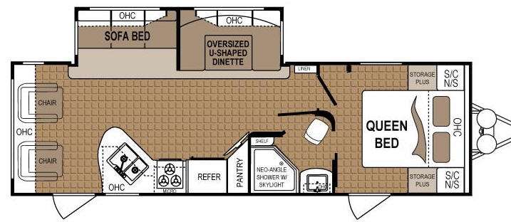 In StockDutchmen Travel Trailer w/Rear Living Area Including: 2 Lounge Chairs, Overhead Storage, Sofa Bed & Oversized U-Shaped Dinette Slideout, Dbl. Kitchen Sink, 3 Burner Range, Microwave, Refrigerator, Pantry, Side Aisle Bath w/Neo-Angle Shower w/Skylight, Shelf, Sink w/Overhead & Toilet, Linen Cabinet in Hall, Front Queen Bed w/Shirt Closets Above Nightstands Both Sides, Storage Plus, Private Bedroom Entry & Much More!