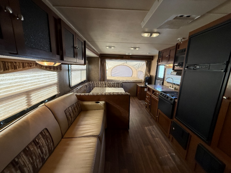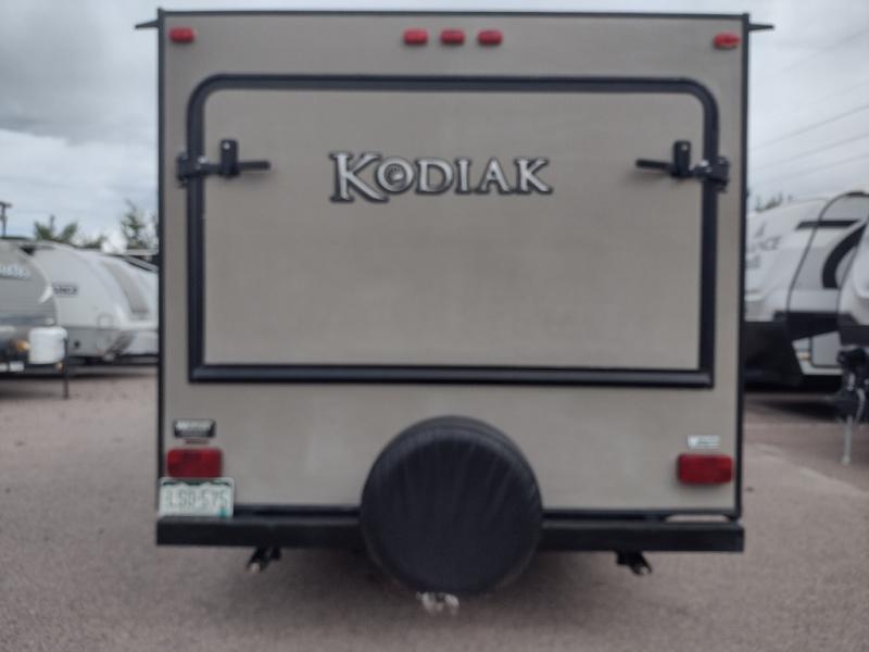 Single Slide Kodiak Expandable Travel Trailer w/Front & Rear Queen Tent End Beds w/Shelf, Bath Including Neo-Angle Shower w/Skylight, Sink w/Overhead Cab. & Toilet, Pantry, Refrigerator, 3 Burner Range, Dbl. Kitchen Sink, Wardrobe, Sofa Bed & U-Shaped Dinette Slideout, 2 Front End Tables Either Side w/TV and More!