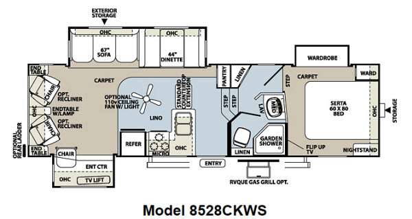 Triple Slide Flagstaff Classic Super Lite Fifth Wheel, Rear Living Area w/2-Lounge Chairs, End Tables, Chair/Ent. Center/TV Lift Slide, Refrig., 3-Burner Range, Microwave, Double Kitchen Sink, Sofa/Dinette Slide, Pantry, Step Up To Bed/Bath, Linen, Toilet, Linen, Shower, Lav., Med. Cab., Flip Up TV, Queen Bed, Wardrobe Slide, Ward., Nightstand, Overhead Cabinets Thru, Ext. Storage & Much More. Available Options May Include: Rear Ladder, Gas Grill, Ceiling Fan w/Light, C'Top Extension