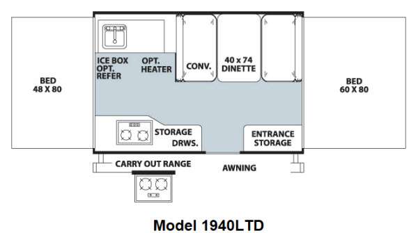 Forest River Freedom/LTD Two Tent End Beds, Ice Box, Booth Dinette, Entrance Storage, 2 Burner Range, Storage, Drawers, Carry Out Range, and More! Available Options May Include: Refrigerator, Heater.
