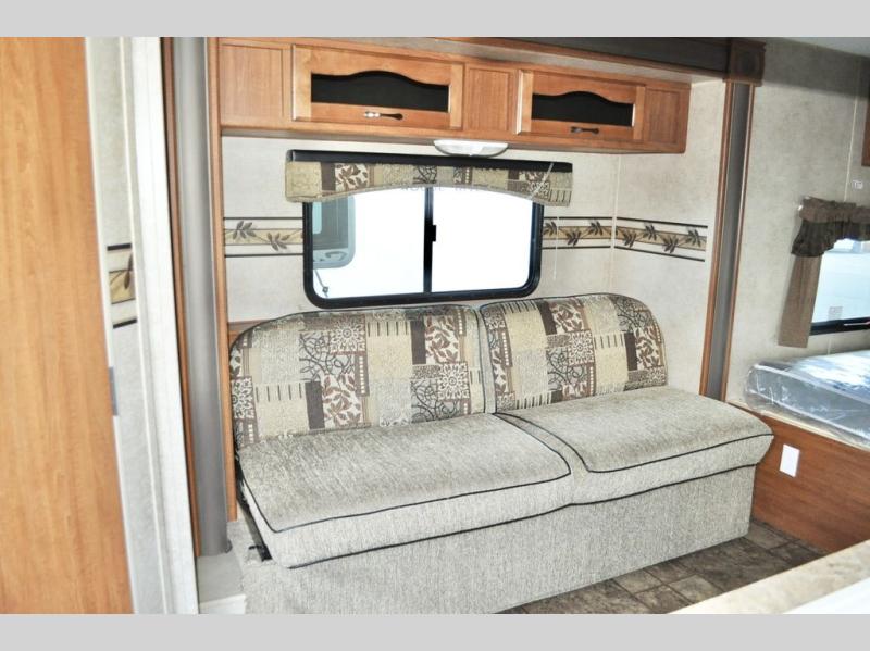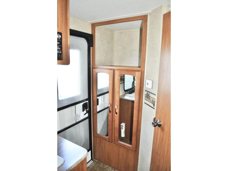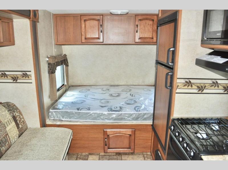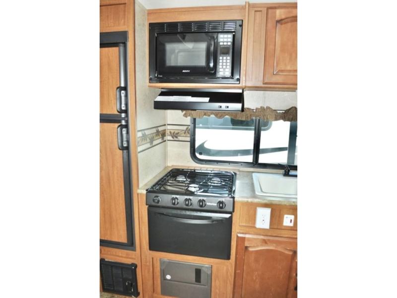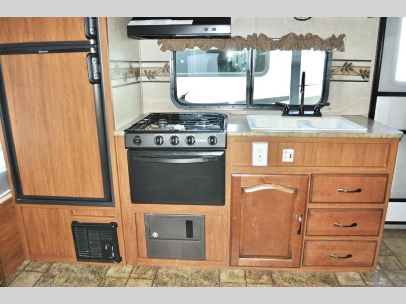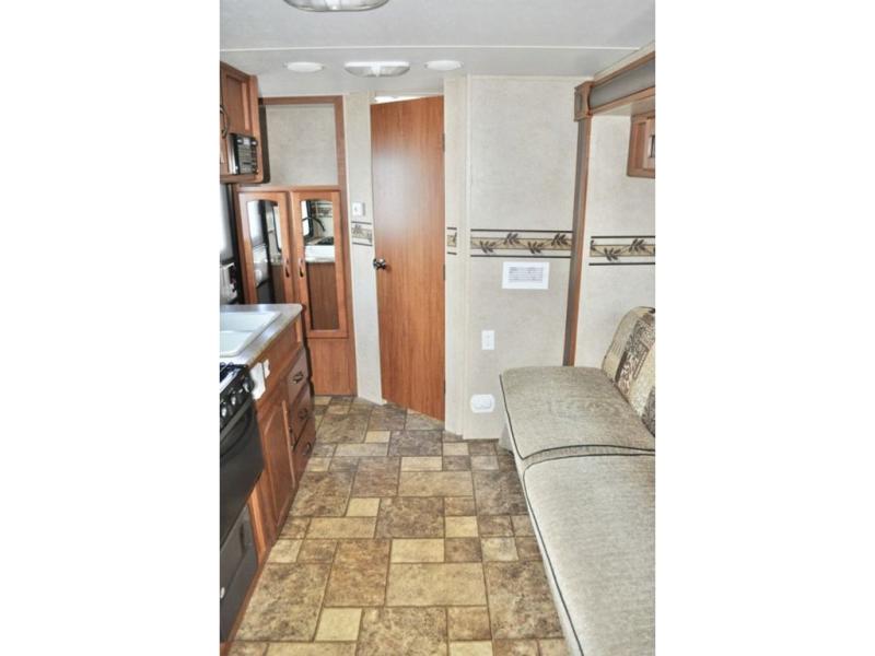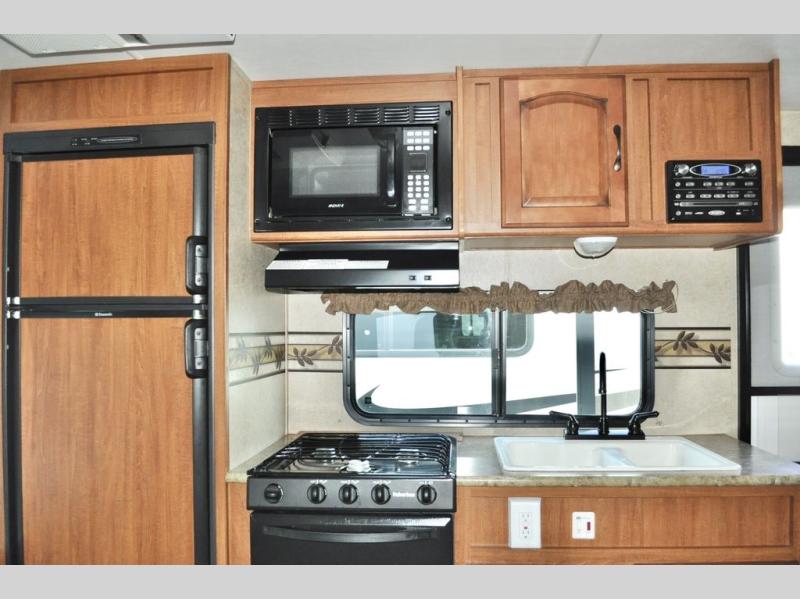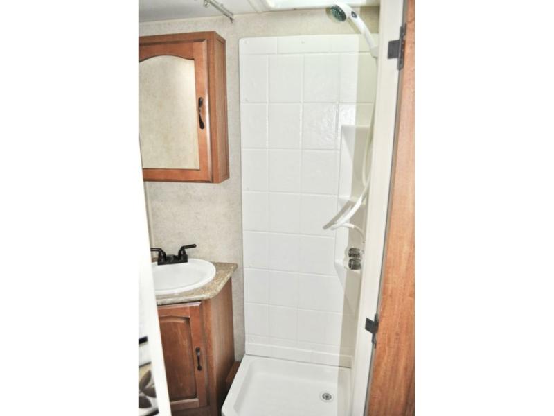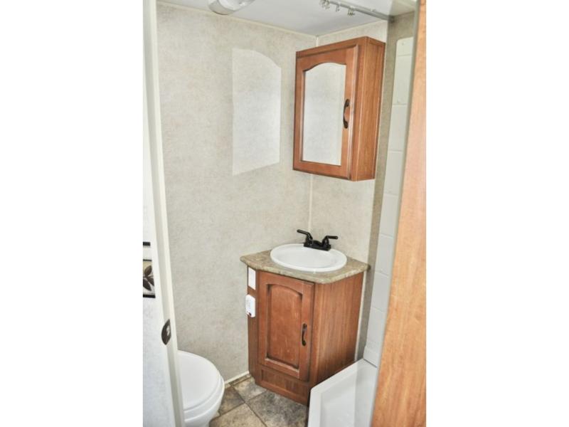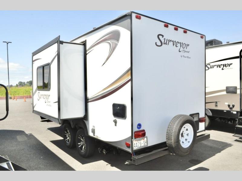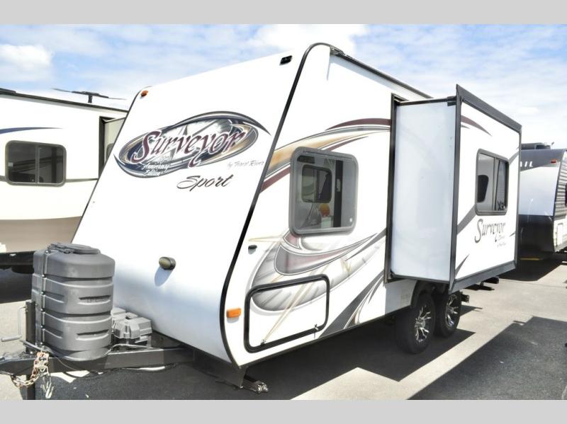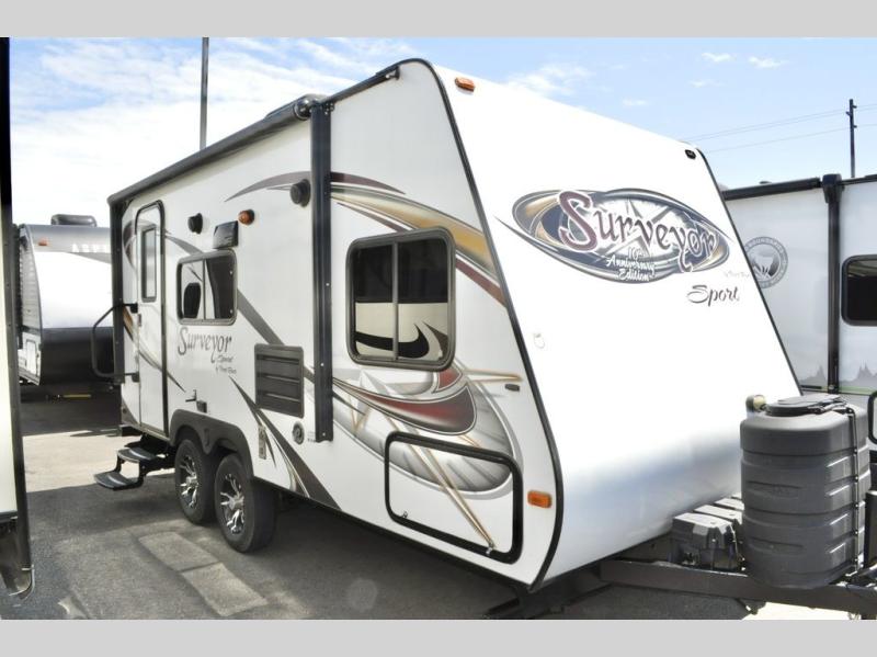 Single Slide Out Surveyor Sport Travel Trailer w/Rear Bathroom, Shower, Lav., Sink, TV/Wardrobe Closet, Double Kitchen Sink, 3 Burner Range, Refrigerator, Overhead Cab., Slide Out Sofa w/Shelf & Storage, Overhead Cab., Table, Front Queen Bed, Overhead Cab., Pass Thru Storage and More. Available Options May Include: Front Overhead Bunk
