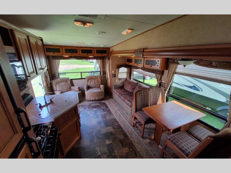 Heartland Sundance XLT Fifth Wheel w/Rear Living Area Including 2 Lounge Chairs w/Overhead Storage, Sofa & Booth Dinette Slide, Dbl. Kitchen Sink/3 Burner Range, Refrigerator, Pantry/Linen Cabinet, Ent. Center, Step Up to Side Aisle Bath w/Angle Shower, Toilet & Sink, Front Queen Bed w/Storage Both Sides and Above, Slideout Wardrobe & Much More!