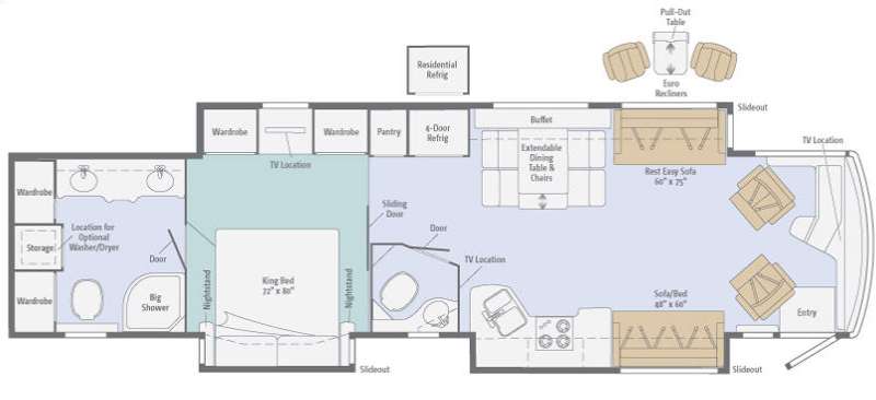 Ellipse Class A Diesel Coach by Itasca w/Rear Full Bath Including: Ward./Storage Cab./Ward., Dbl. Sinks w/Overhead, Corner Big Shower, Toilet, King Bed Slideout w/Nightstands, Ward./26" LCD TV/Ward./Pantry/4-Door Refrig./Extendable Dining Table w/Chairs/Rest Easy Sofa Full Wall Slide, 40" LCD TV Above Cab., Sofa/Bed, 3 Burner Range, Dbl. Kitchen Sink, 1/2 Bath w/Sink and Much More! Avail. Options May Include: Wash/Dryer, Res. Refrig., Euro Recliners w/Pull Out Table.
