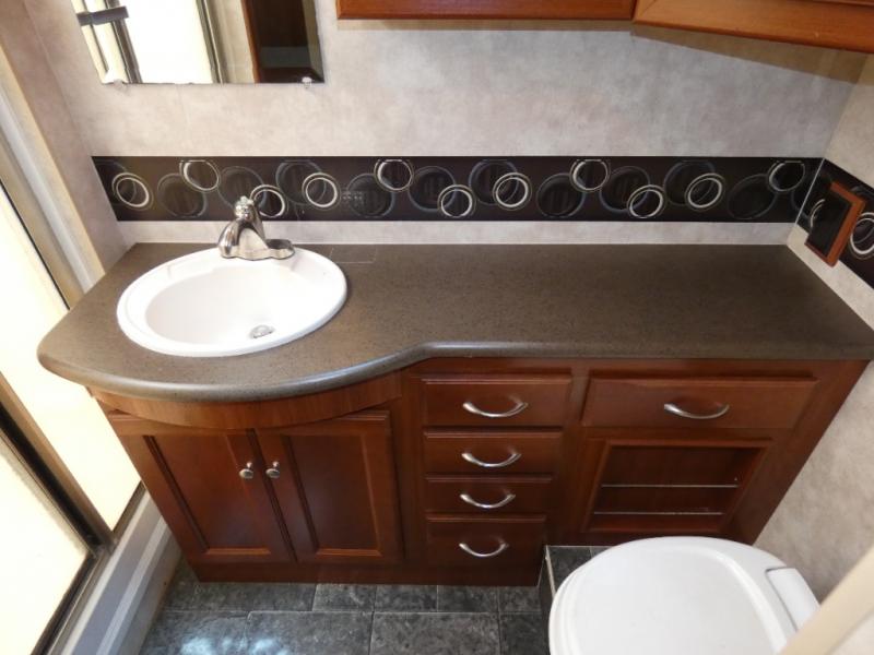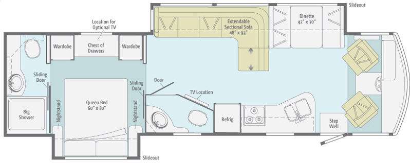 Itasca Sunstar Class A Motorhome w/1-1/2 Bath, Rear Full Bath Including Shower, Vanity w/Sink, Toilet & Overhead Cabinet, Sliding Door to Bedroom w/Slideout Queen Bed & Nightstands, Wardrobe, Chest of Drawers, 2nd Wardrobe, Sliding Door to Living Area, L-Shaped Extendable Sectional Sofa & Booth Dinette Slide, 1/2 Bath, 32" LCD TV, Refrig., 3 Burner Range, Dbl. Kitchen Sink and Much Much More!