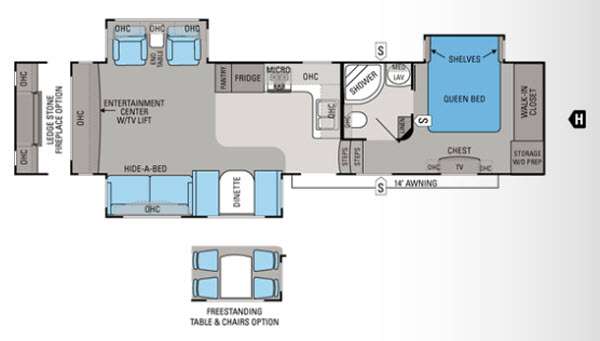 Triple Slide Jayco Eagle FW, Rear Ent. Ctr. w/TV Lift, Hide-A-Bed/Dinette Slideout w/Overhead Cab., Two Lounge Chairs w/End Table Slideout, Pantry, Refrig., Micro., 3 Burner Range, Dbl. Kitchen Sink, Step Up Bath/Bedroom, Shower, Lav., Toilet, Linen, Front Queen Bed Slide w/Shelves, Ward., Chest, TV Storage/Washer/Dryer Prep, 14' Awning & More. Available Options May Include: Ledgestone Fireplace, Table w/Chairs.