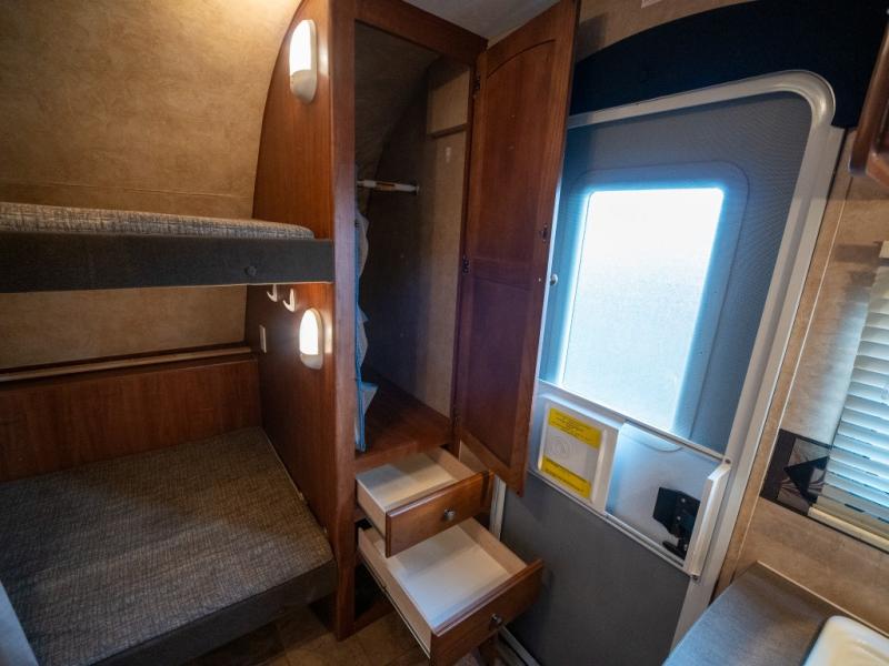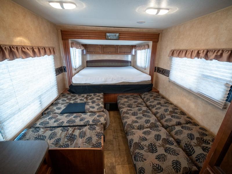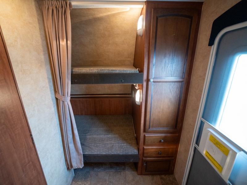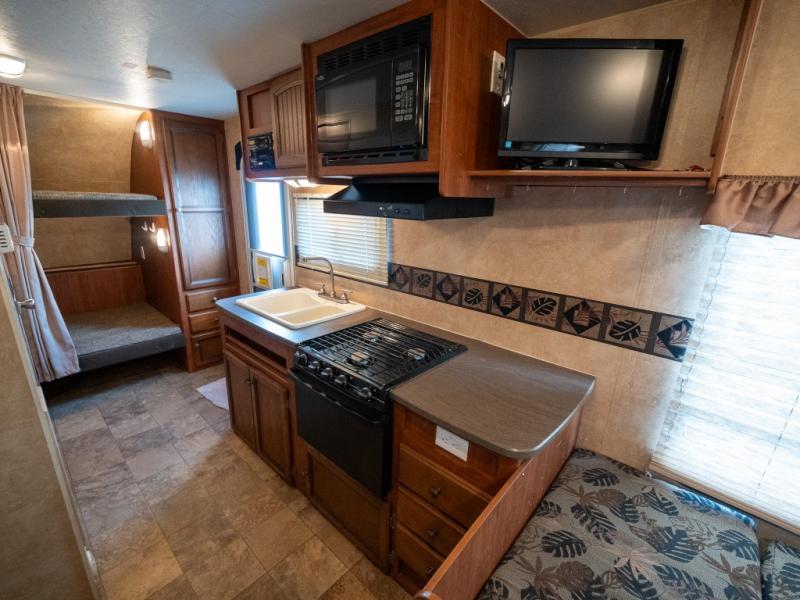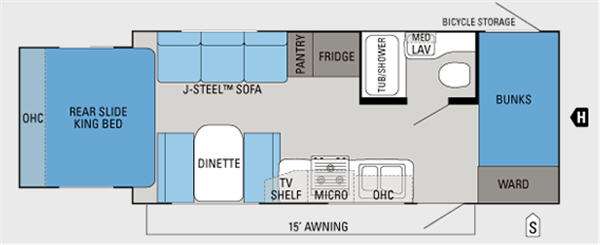Jay Feather Ultra Lite Expandable by Jayco, Rear Slide King Bed Expandable, J-Steel Sofa, Booth Dinette, TV Shelf, Microwave, 3 Burner Range, Double Kitchen Sink, Pantry, Refrig., Tub/Shower, Toilet, Front Bunk Beds w/Wardrobe, Overhead Cabinets Throughout, Bicycle Storage, 15' Awning and More.