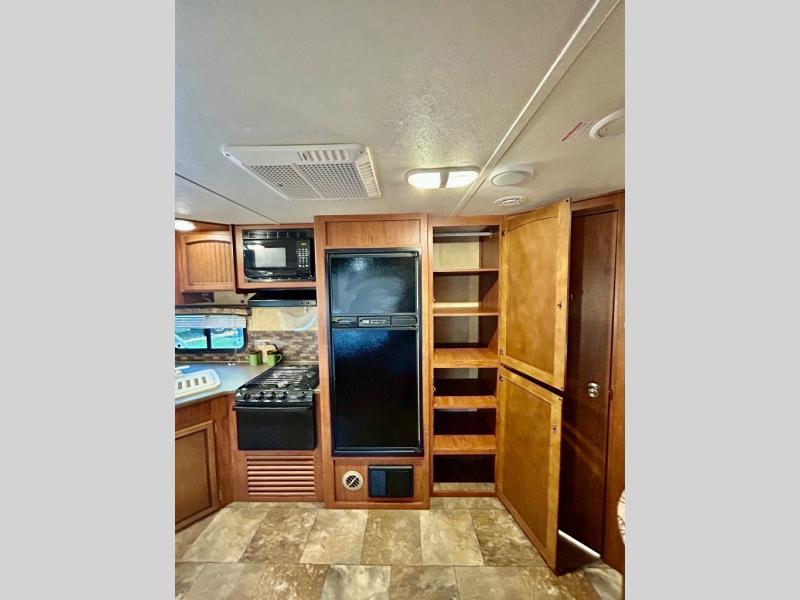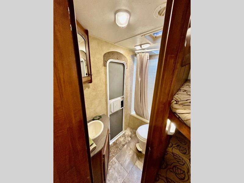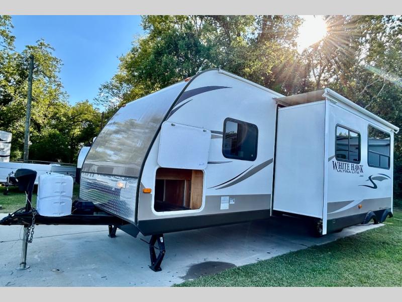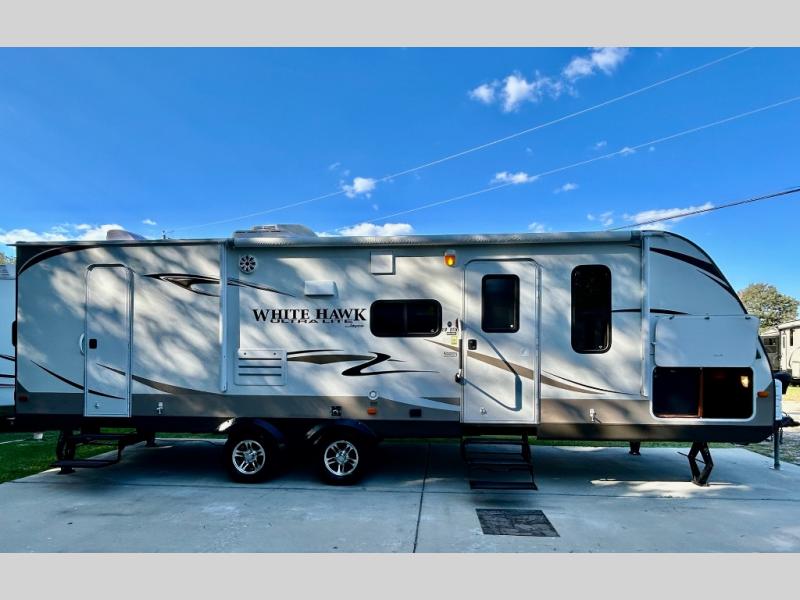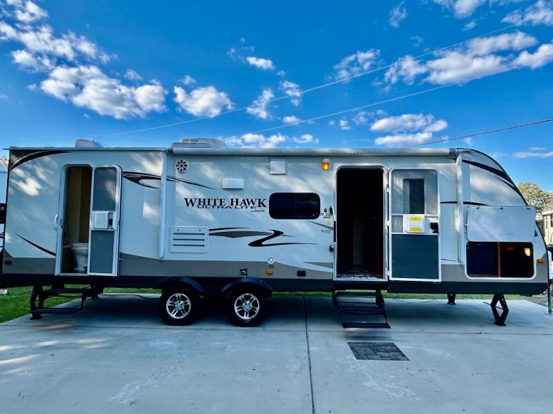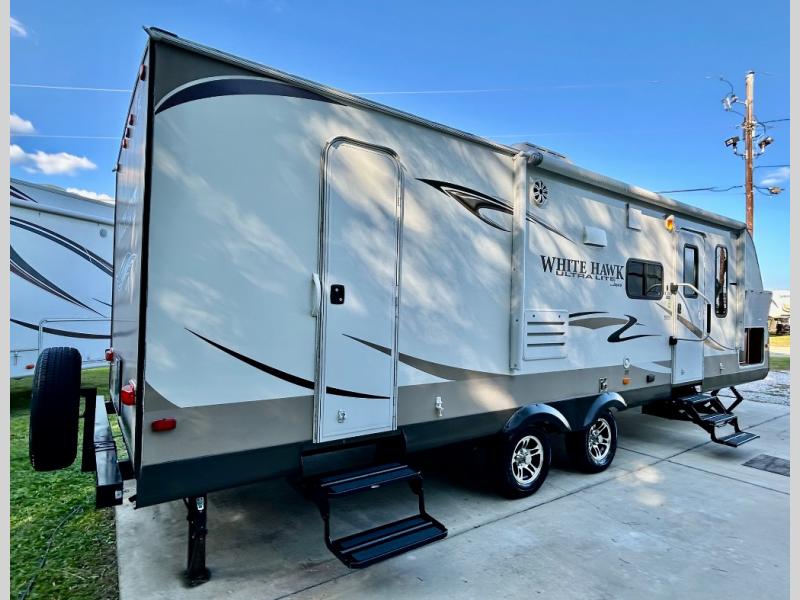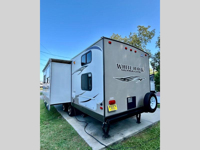 Single Slide White Hawk Travel Trailer, Rear Double Bed Bunk Beds, Tub/Shower, Toilet, Lav., Med Cab., Pantry/Ward., Refrigerator, Microwave, 3-Burner Range, Dbl. Kitchen Sink, Entertainment Center, Queen Bed, Dbl. Wardrobes, Sofa/Dinette Slide, Pantry, Overhead Cabinets Throughout & Much More. Available Options May Include: Free-Standing Table & Chairs, Hide-a-Bed.