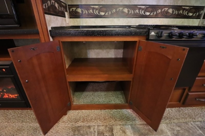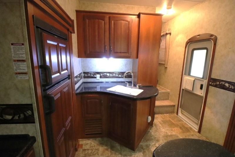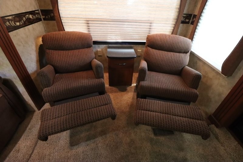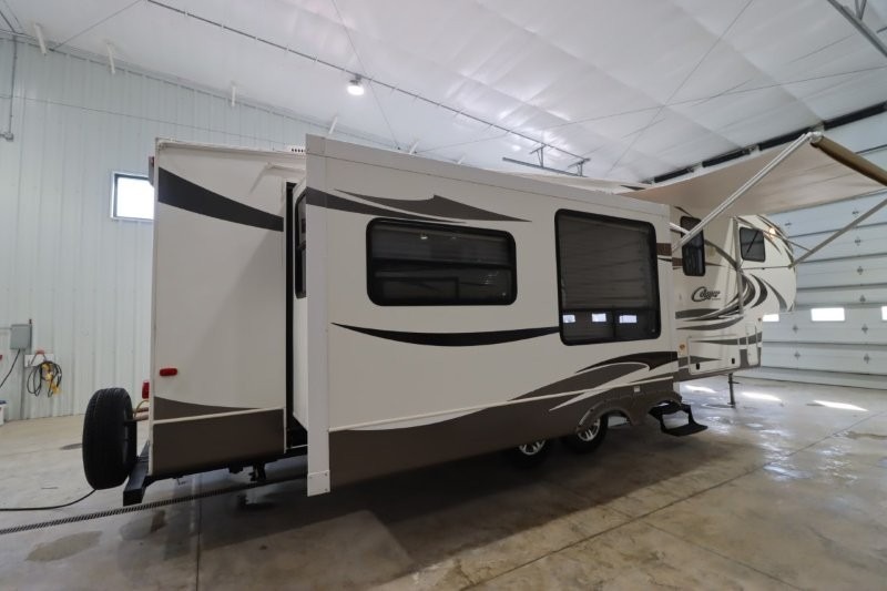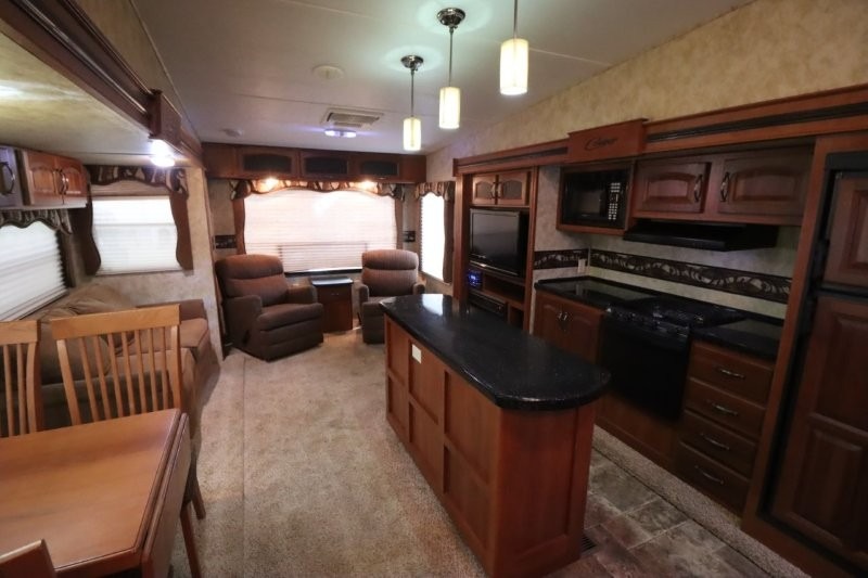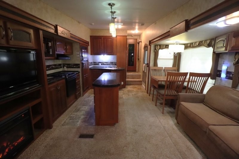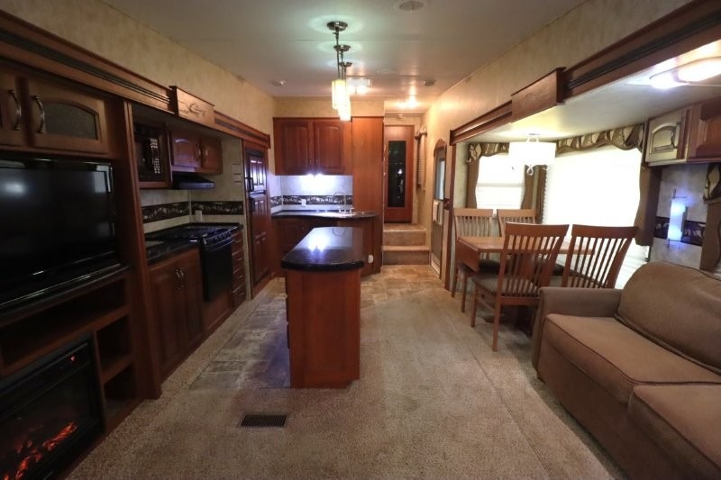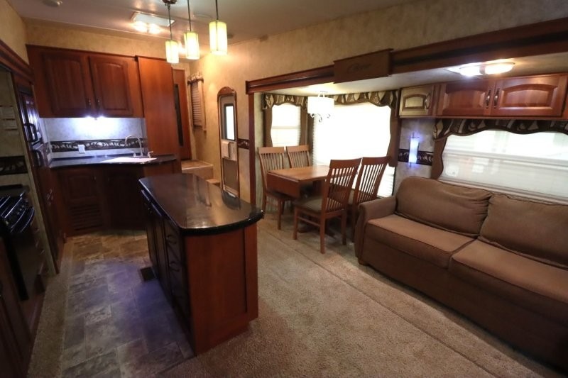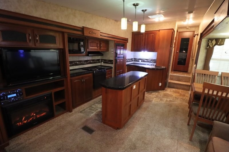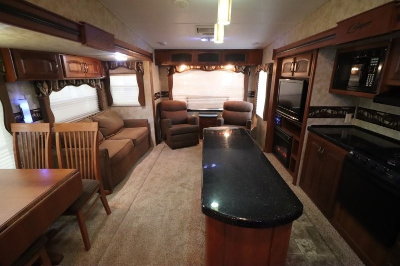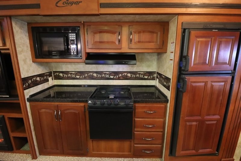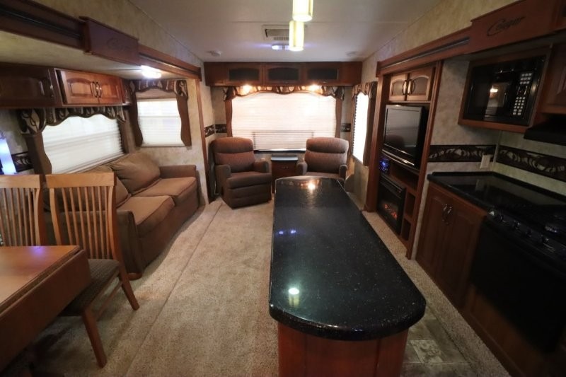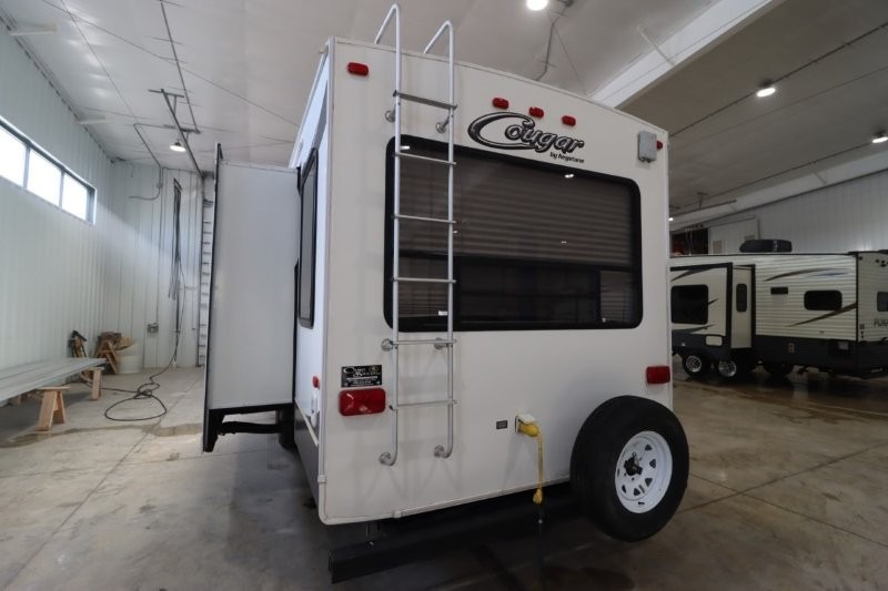Keystone Cougar Fifth Wheel w/Rear Living Area Including 2 Lounge Chairs w/Overhead Cabinet, Slideout Sofa & Booth Dinette, LCD TV/3 Burner Range & Refrigerator Slide w/Overhead Storage, Kitchen Island, Dbl. Kitchen Sink, Step Up to Side Aisle Bath w/Neo-Angle Shower, Sink & Toilet, Linen Cabinet, Dbl. Bath Entry, Front Queen Bed Slide, Full Height Wardrobe w/Sliding Doors, Ward., Window Storage and Much More!