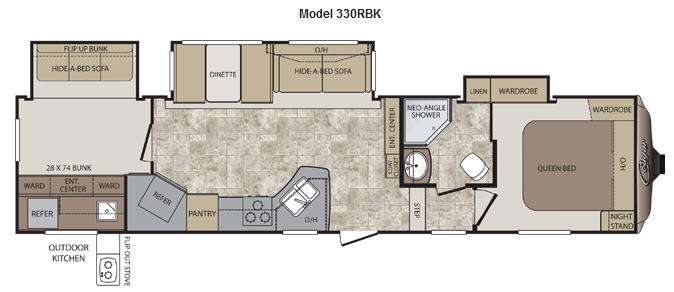 Cougar Fifth Wheel by Keystone RV w/Rear Slideout Hide-A-Bed Sofa w/Flip Bunk Above, Bunk Above Ent. Center/Wardrobes, Refrig., Pantry, 3 Burner Range, Dbl. Kitchen Sink, Booth Dinette & Hide-A-Bed Sofa Slideout, Ent. Center, Coat Closet, Step Up to Side Aisle Bath w/Neo-Angle Shower, Toilet & Sink, Linen/Wardrobe Slide, Queen Bed w/Wardrobe & Night Stand, Overhead Cabinets, Rear Outdoor Kitchen w/Flip Out Stove, Refrig., & Sink and Much More!