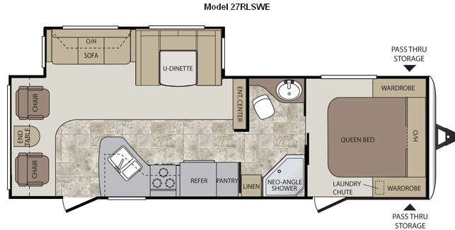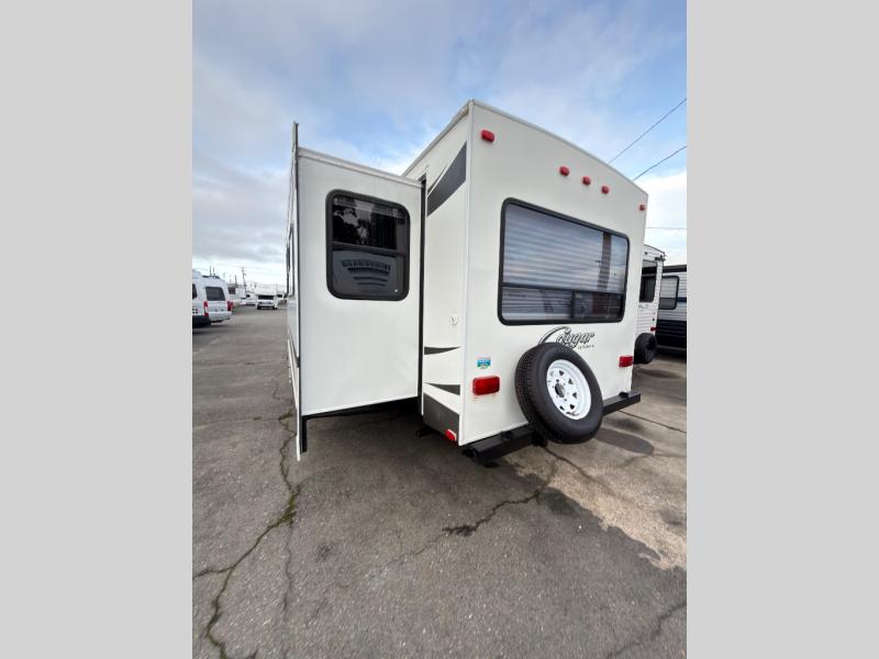 Single Slide Cougar 1/2 Ton Series Travel Trailer w/Rear Living Area w/2 Lounge Chairs w/End Table Between and Overhead Storage, Sofa & U-Shaped Booth Dinette Slide, LCD TV, Dbl. Kitchen Sink, 3 Burner Range, Refrigerator, Pantry, Walk-Thru Bath w/Vanity & Sink, Toilet, Neo-Angle Shower & Linen Cabinet, Front Queen Bed w/Nightstands, Laundry Chute, Private Bedroom Entry, Pass-Thru Storage and Much More!