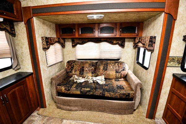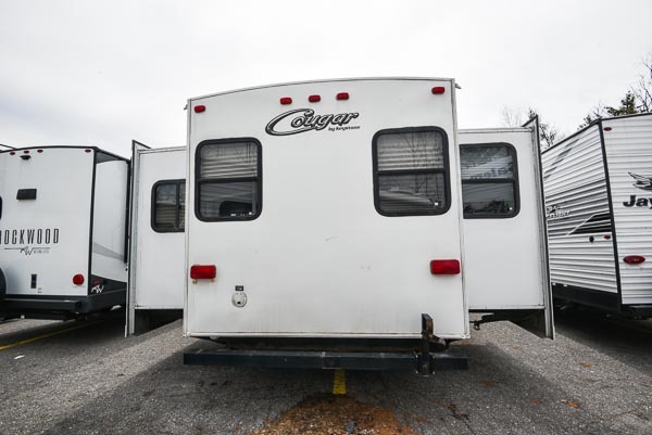 Single Slide Cougar 1/2 Ton Series Fifth Wheel by Keystone, Rear Living Space w/2 Chairs & End Table, Sofa & Booth Dinette Slideout w/Overhead Storage Above Sofa, Double Kitchen Sink, 3 Burner Range, Refrigerator, Pantry, Ent. LCD TV, Neo-Angle Shower, Wardrobe/Linen Cabinet, Private Toilet Area, Front Queen Bed w/Wardrobes, Overhead Storage, Laundry Chute & More.