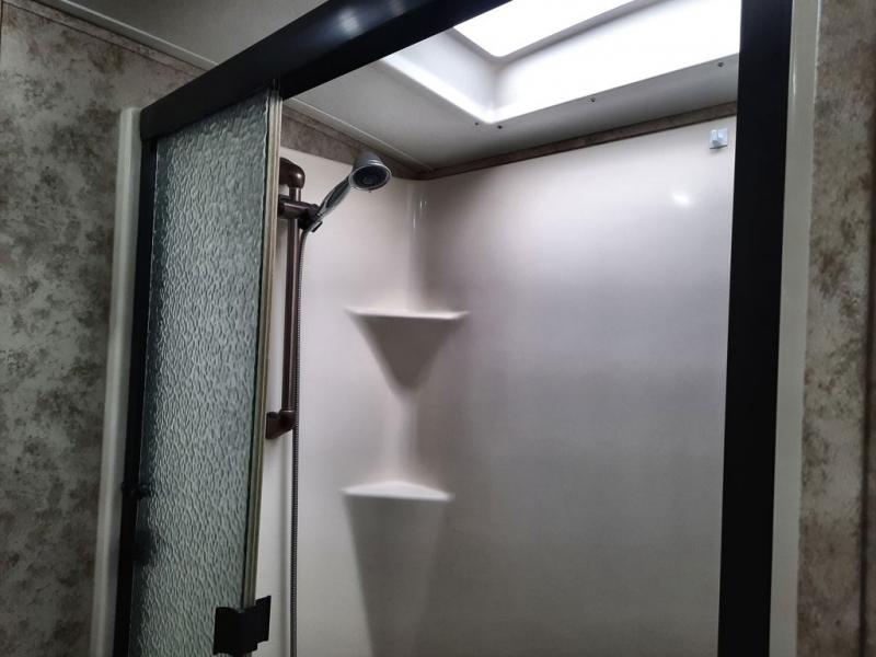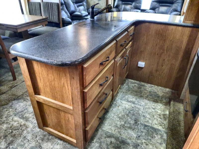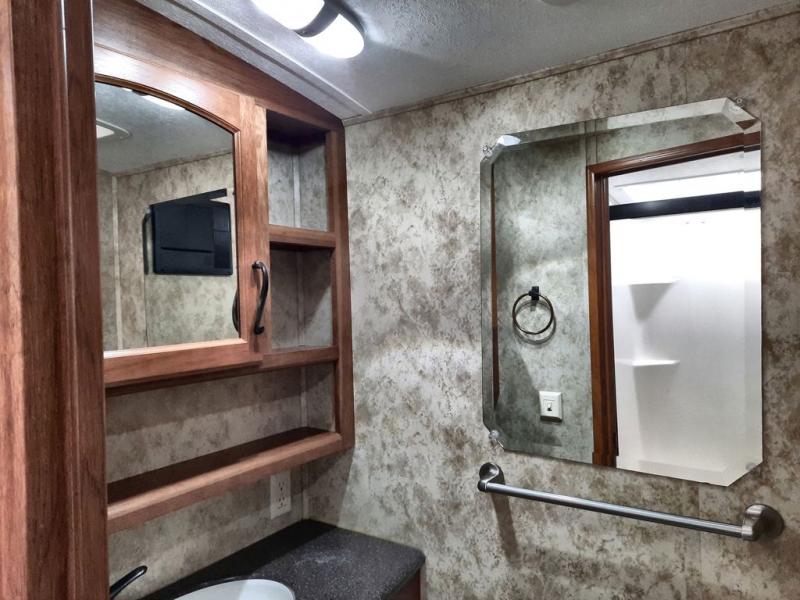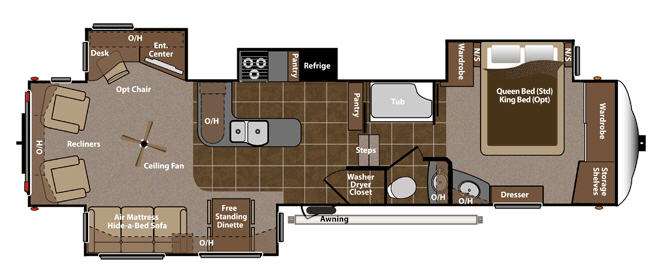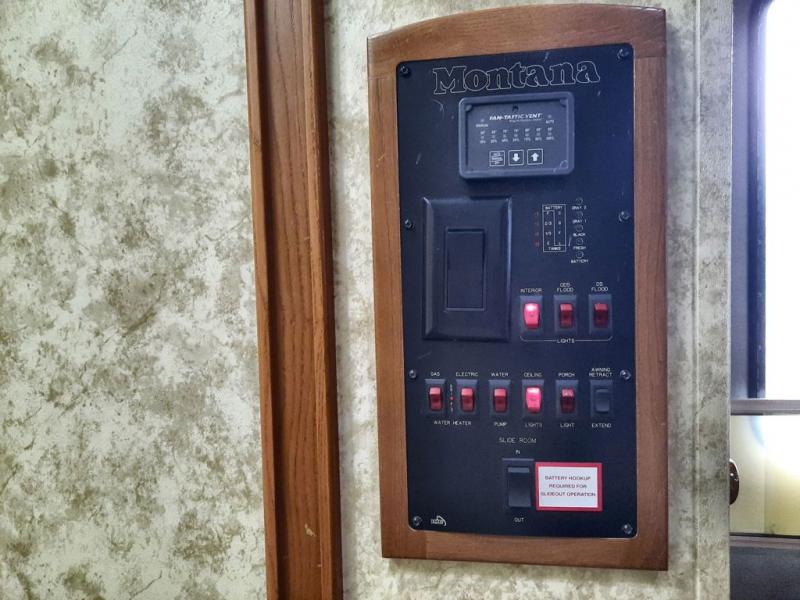 Keystone Montana FW w/Rear Living Area Including: 2 Recliners, Overhead Storage, Ceiling Fan, Slideout Desk/Ent. Center w/Overhead Storage, Slideout Air Mattress Hide-A-Bed & Free Standing Dinette, L-Counter w/Dbl. Kitchen Sink & Overhead Cabinets, Slideout 3 Burner Range/Pantry & Refrig., 2nd Pantry, Washer/Dryer Closet, Step Up to Bed & Split Bath w/Private Toilet Area Including Sink & Overhead, Tub/Shower, Separate Sink in Bedroom, Dresser, Queen Bed Slide w/Wardrobe & Nightstands, & More.