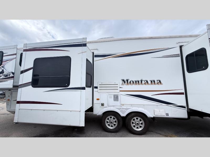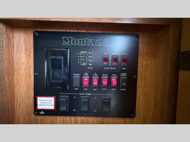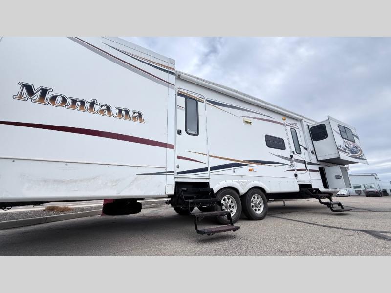 Keystone Montana FW w/Step Up to Front Living Area Incl. Full Wall Ent. Center w/40" LCD TV, L-Lounge Slide, Hide-A-Bed Sofa Air Mattress Slide, Entry Closet, Flip Down Comp. Desk, Slideout Free Standing Dinette w/Chairs, Dbl. Kitchen Sink, 12 Cu. Ft. Refrig., 3 Burner Range, Washer Prep, Counter & Cabinet Space, Walk Thru Bath w/Private Ext. Entry, Sink, Toilet & Neo-Angle Shower, Rear Queen Bed Slide, Slideout Ward., 19" LCD TV & More! Available Options May Include: King Bed, Fireplace.