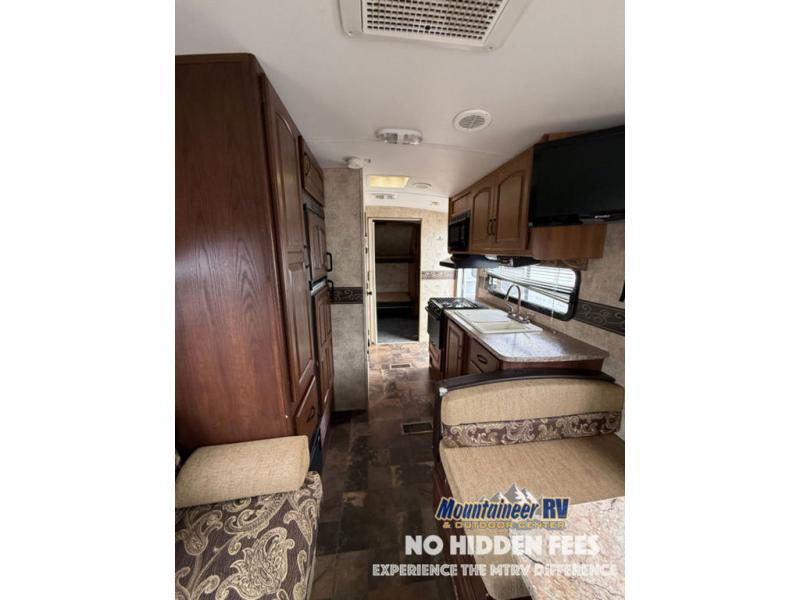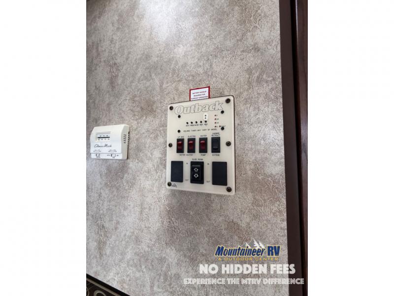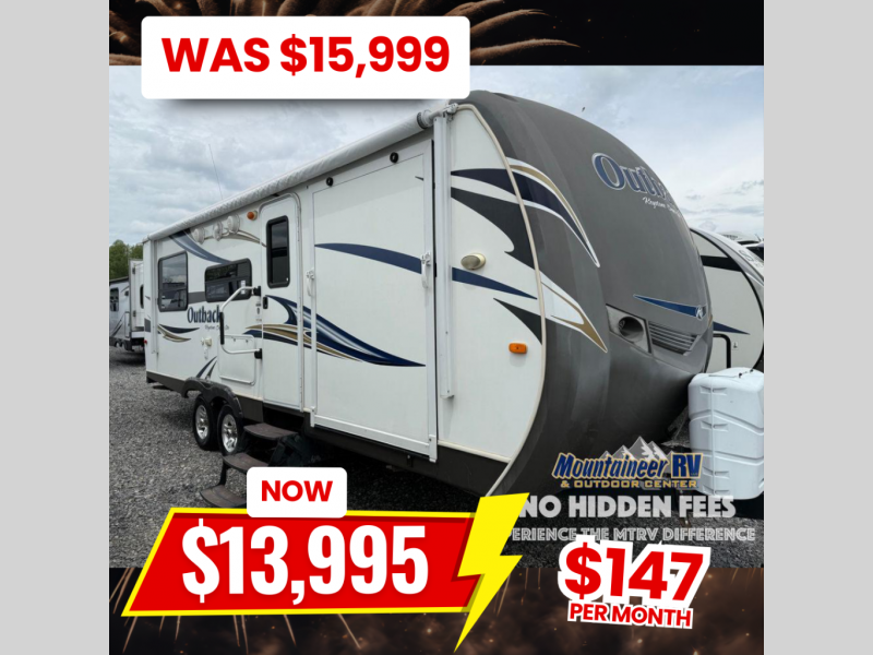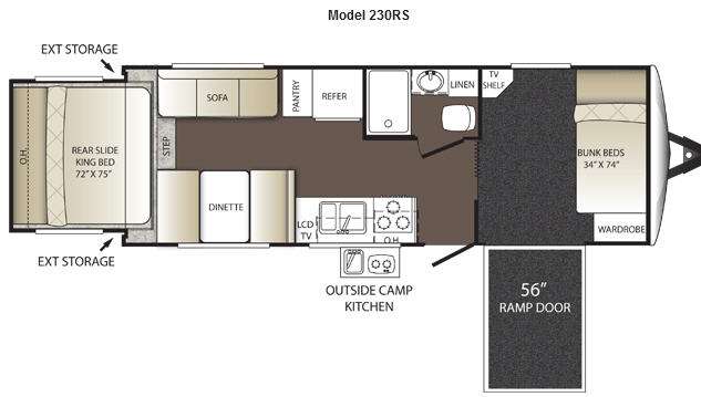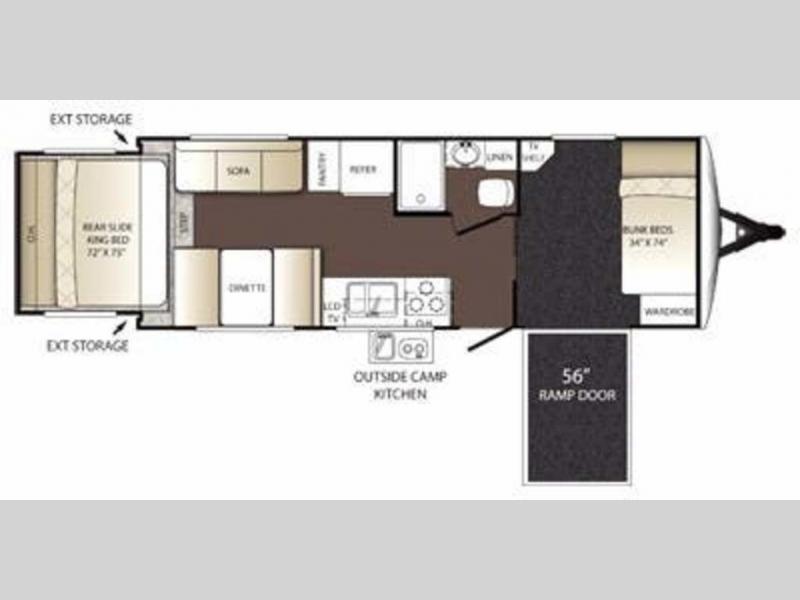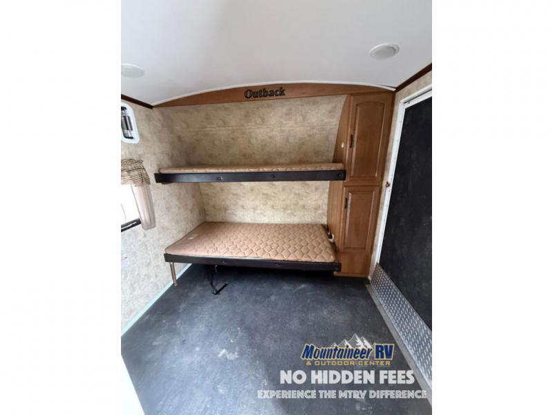Single Slide Outback Travel Trailer Toy Hauler w/Rear Slide King Bed, Booth Dinette, Sofa, Pantry, Refrigerator, Double Kitchen Sink, 3 Burner Range LCD TV Above Sink, Linen Closet, Tub, Toilet, Lav., Front Cargo Area w/56" Ramp Door, Bunk Beds w/Wardrobe, Rear Pass-Thru Storage and More.