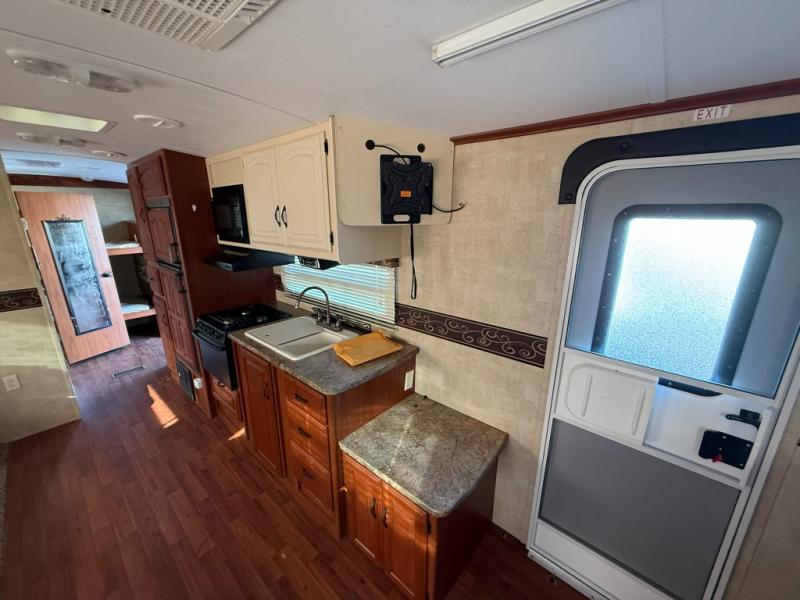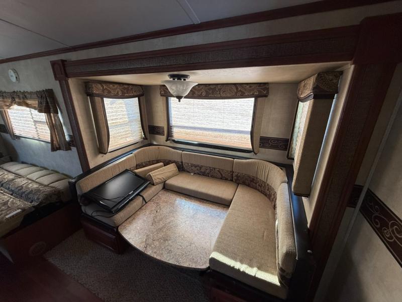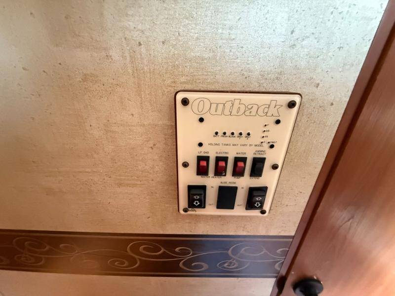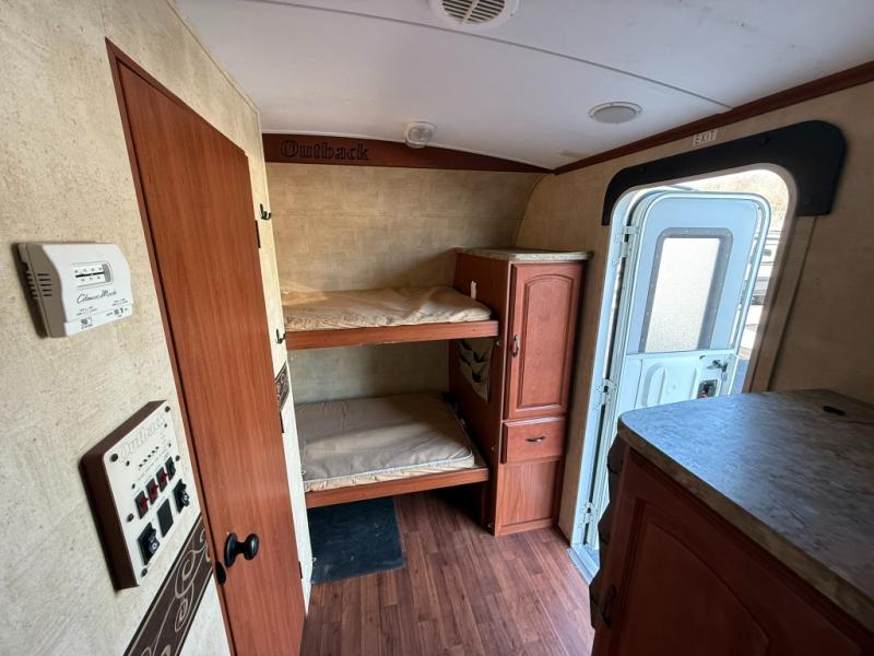 Double Slide Outback Travel Trailer w/Rear Slide King Bed, Pass Thru Storage, Sofa, LCD TV, King Dinette Slideout, Dbl. Kitchen Sink, 3 Burner Range, Refrig., Pantry, Tub, Lav., Linen, Toilet, Ward./TV Shelf, Front Bunk Beds w/Ward., Bike Storage in Front, Outside Camp Kitchen and More.