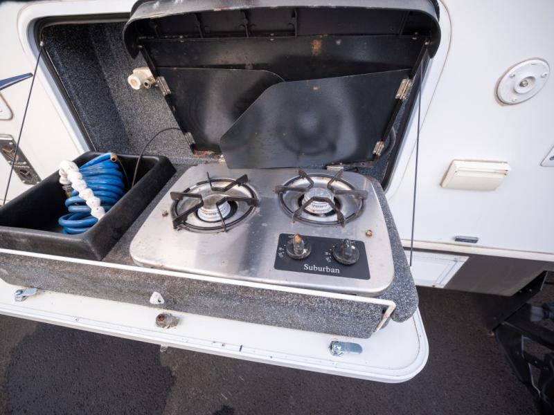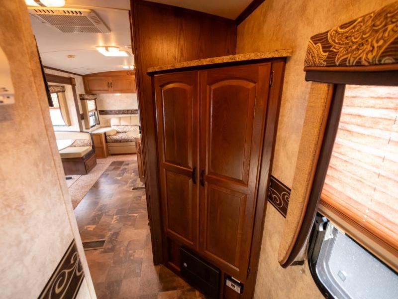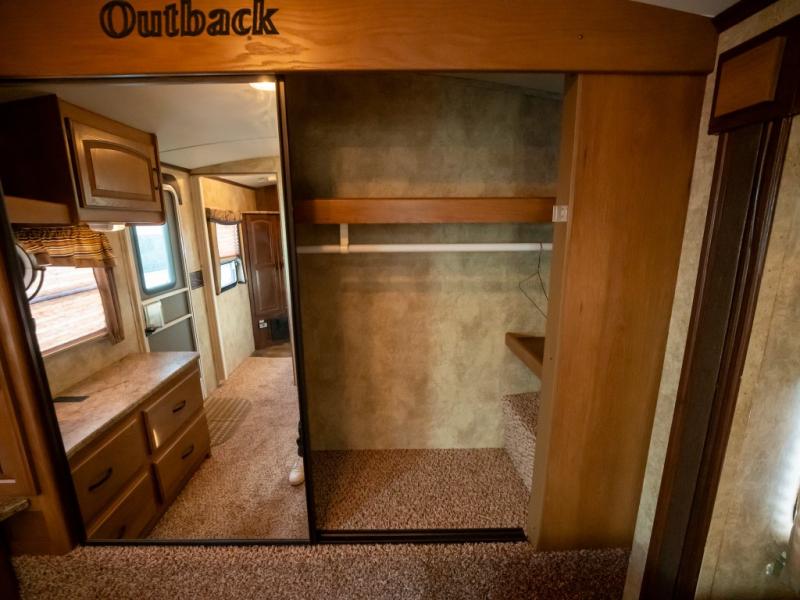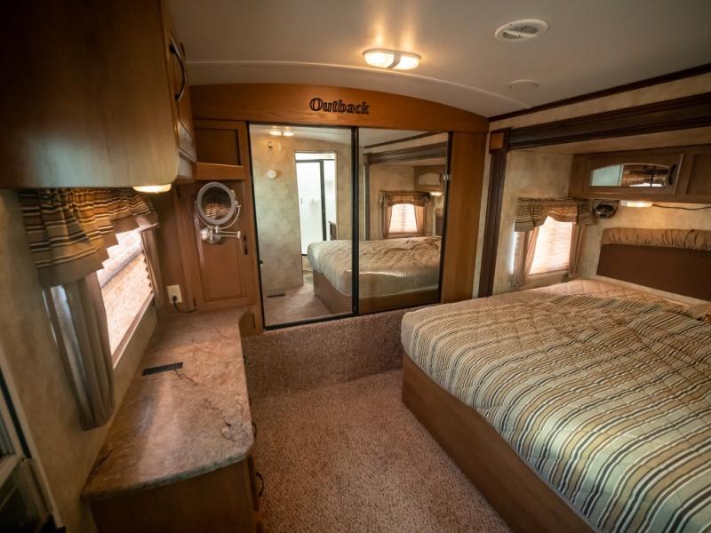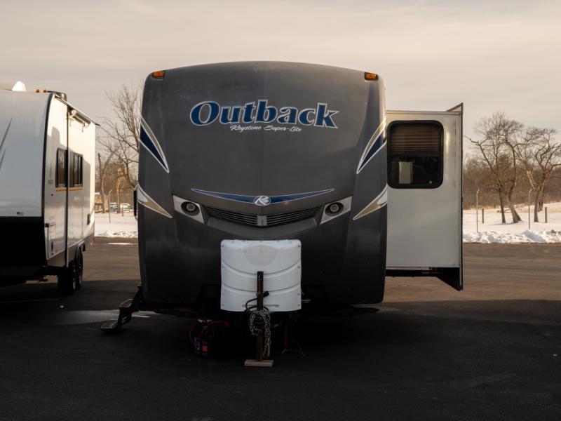 Double Slide Outback Trailer by Keystone w/Rear Queen Bed Slideout, Overhead Storage, Exterior Storage, Rear Pass-Thru Storage, Wardrobe, Dresser, Private Bedroom Entry, Side Aisle Bath w/Angle Shower, Sink & Toilet, Linen Cabinet, Ent. Center/Pantry, Refrigerator, 3 Burner Range, Double Kitchen Sink, King U-Dinette Slideout, Front Sofa w/Pass-Thru Storage, Outside Camp Kitchen and More!