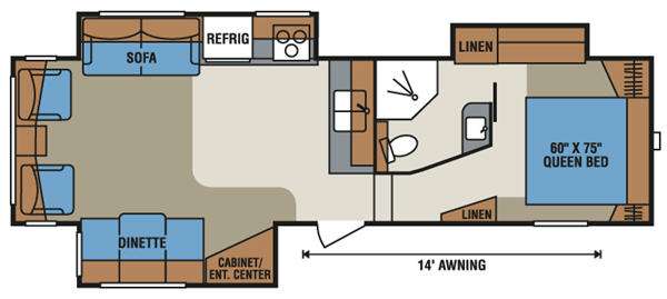 Triple Slide Durango 1500 Fifth Wheel, Rear Living Area, Dinette/Cabinet/Ent. Center Slideout, 2 Lounge Chairs, End Table, Sofa/Refrig./3-Burner Range/Microwave Slideout, Double Kitchen Sink, Step Up to Bath, Toilet, Shower, Lav., Linen, Front Queen Bed, Double Closets, Linen Slideout, Overhead Cabinets Throughout, 14' Awning & Much More!