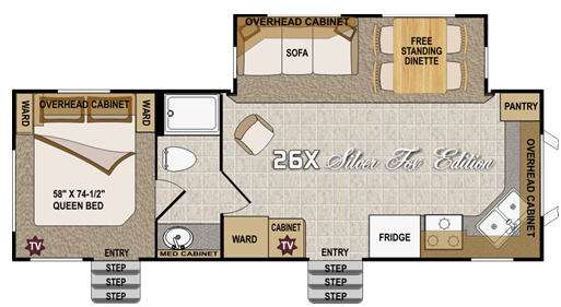Single Slide Silver Fox Edition Arctic Fox Travel Trailer by Northwood, Rear Queen Bed w/Private Entry, Wardrobes, Overhead Cabinets, Walk-Thru Bath w/Shower, Vanity w/Med. Cabinet, Toilet, Wardrobe, TV Cabinet, Jackknife Sofa & Booth Dinette Slideout, Front Kitchen w/Pantry, Counter Space & Overhead Cabinets, Double Kitchen Sink, 3 Burner Range & Refrigerator, Triple Entry Steps and More! Available Options May Include: Free Standing Dinette, Hide-A-Bed Sofa, Tub/Shower