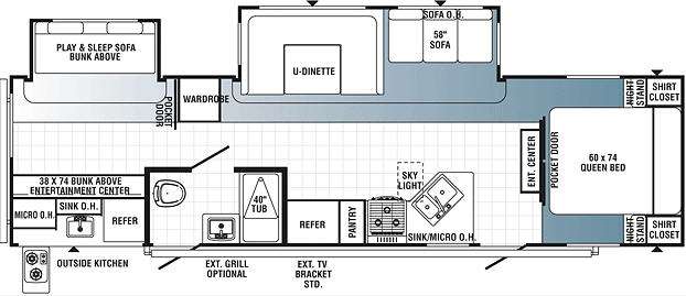 Palomino Puma Bunkhouse Travel Trailer w/Rear Play & Sleep Sofa Slide w/Bunk Above, 3rd Bunk w/Ent. Center Above, Rear Outside Kitchen w/2 Burner Cooktop, Micro., Sink & Refrigerator, Wardrobe, Bath w/Private Entry w/Toilet, Sink & Tub/Shower, Refrig., Pantry, 3 Burner Range, Dbl. Kitchen Sink, Skylight, U-Dinette & Sofa Slideout, Ent. Center, Front Queen Bed w/Shirt Closets & Nightstands and Much More! Avail. Options May Include: Grill.