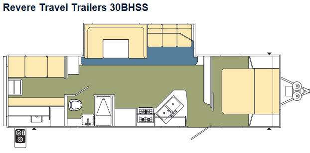 Revere Quad Bunk Travel Trailer w/Rear Bunkhouse Including: Dinette w/Bunk Above, Table, Bunks, Pantry, Slideout U-Dinette & Sofa w/Overhead Storage, Ent. Center, Dbl. Kitchen Sink, 3 Burner Range, Refrigerator, Tub/Shower, Toilet & Sink, Front Queen Bed w/Wardrobes Both Sides of Bed, Overhead Storage, Pass-Thru Exterior Storage in Front and More! Available Options May Include: Exterior Rear Kitchen w/Slideout Stove Top, Refrig., Sink & More!