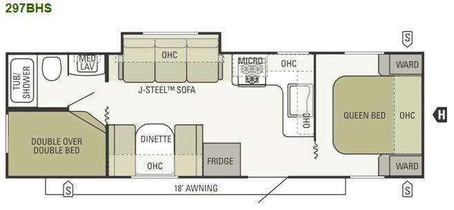 Starcraft Bunkhouse Travel Trailer w/Rear Corner Bath Including Tub/Shower & Toilet, Separate Sink w/Med. Cabinet, J-Steel Sofa Slide, Rear Corner Dbl. Bed w/Dbl. Bed Bunk Above, Booth Dinette w/Overhead Cabinet, Refrigerator, Dbl. Kitchen Sink, 3 Burner Range, Microwave Oven, Front Queen Bed, Shirt Wardrobes w/Chests Below, Pass-Thru Storage in Front, 18' Awning & More!