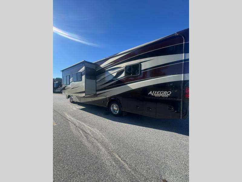Triple Slide Allegro Class A by Tiffin w/Rear Queen Bed Slide w/Nightstands, Wardrobe w/Drawers Below, Private Toilet Area w/Lav., Corner Shower w/Lav., Refrigerator, Booth Dinette & Sofa Bed Slideout, Double Kitchen Sink & 3 Burner Range Slide w/Overhead Cabinets, Lounge Chair, 37" TV and Much More! Available Options May Include: 32" TV Above Cab Area, Driver's Door, 32" TV in Bedroom, Tile Floor in Bedroom, Free Standing Cabinet/Dinette.