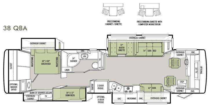 Quad Slide Tiffin Allegro RED Class A Diesel Coach w/Rear Queen Bed w/Nightstands, Rear Closet, Bank of Drawers Below LCD TV & Bunk Bed Slide, Bath w/Linen Cabinet, Corner Shower, Lav. & Toilet, LCD TV, Booth Dinette & 74" Sofa Bed Slide, Overhead Storage Throughout, Slideout Sofa/Microwave/3 Burner Cooktop/Oven & Dbl. Kitchen Sink, 2 Door Refrigerator & Pantry, and More! Available Options May Include: Washer/Dryer, 4-Door Refrig., 32" LCD TV Above Cab Area.