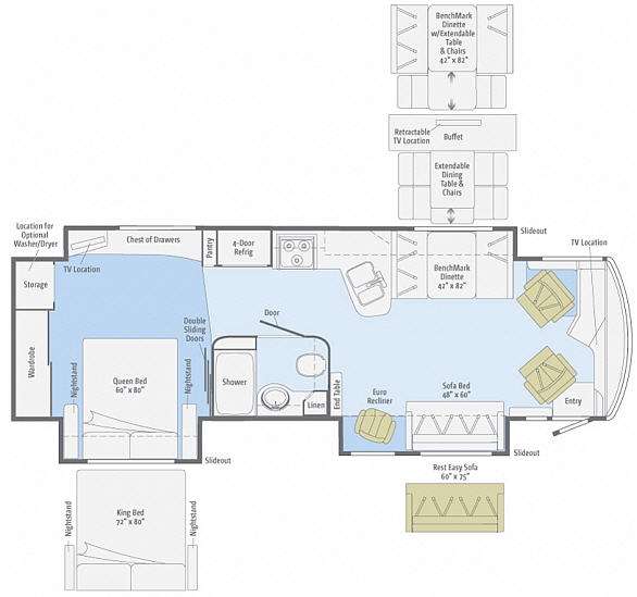 Winnebago Journey Class A Diesel Coach w/Rear Queen Bed Slideout w/Nightstands, Ward., Storage, 26" LCD TV/Chest of Drawers/Pantry/4 Door Refrig./3 Burner Range/Dbl. Kitchen Sink/BenchMark Dinette Full Wall Slide, 32" TV Above Cab Area, Sofa Bed & Euro Recliner Slide, End Table, Bath w/Shower, Toilet, Vanity w/Sink & Linen Cabinet, Dbl. Sliding Door Between Hall & Bedroom, & More! Avail. Options May Include: King Bed, Rest Easy Sofa, Extendable Dinette w/Buffet, Wash/Dryer.