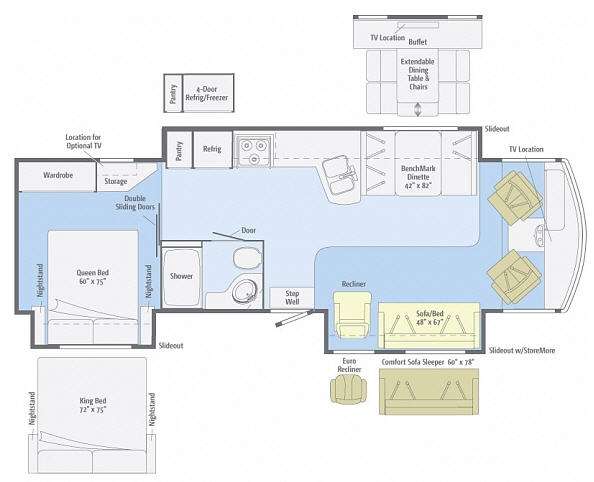 Triple Slide Sightseer Class A Coach w/Rear Queen Bed w/Nightstands Slideout, Wardrobe/Storage, Dbl. Sliding Door, Bath w/Shower, Vanity w/Sink & Toilet, Pantry/Refrig./3 Burner Range/Dbl. Kitchen Sink & BenchMark Dinette Slide, TV Above Cab Area, Slideout Sofa Bed & Recliner and Much More! Available Options May Include: King Bed, Comfort Sofa Sleeper IPO Sofa Bed, Dining Table & Chairs w/Buffet & 40" LCD TV, Bedroom TV.