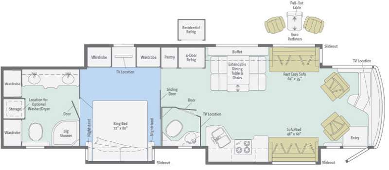 Winnebago Tour w/1-1/2 Bath Includ. Rear Full Bath w/Wardrobes & Storage, Big Shower, Vanity w/Dual Sinks & Toilet, King Bed Slideout w/Nightstands, Ward./26" LCD TV/Ward./Pantry/4 Door Refrig./Extendable Dining Table & Chairs w/Buffet/Rest Easy Sofa Full Wall Slideout, Sofa Bed/3 Burner Range & Dbl. Kitchen Sink Slide Opposite, 1/2 Bath w/Vanity & Sink, 32" LCD HD TV and Much More!