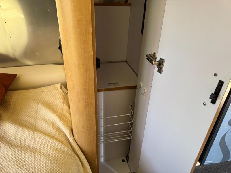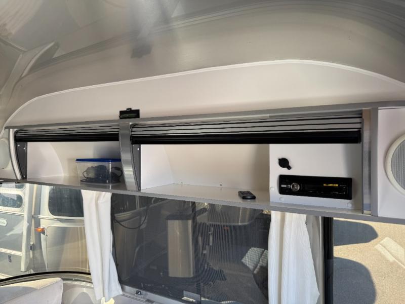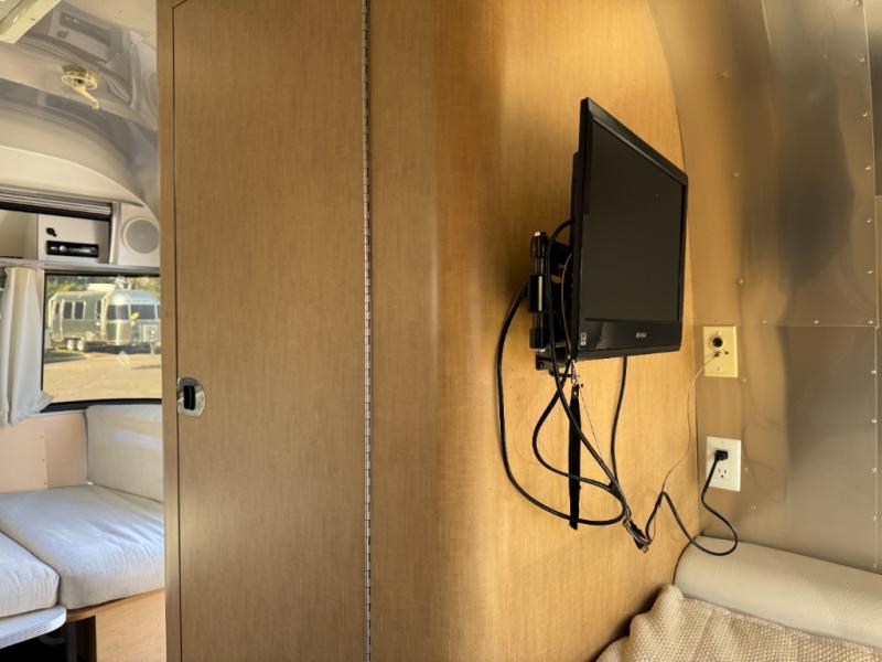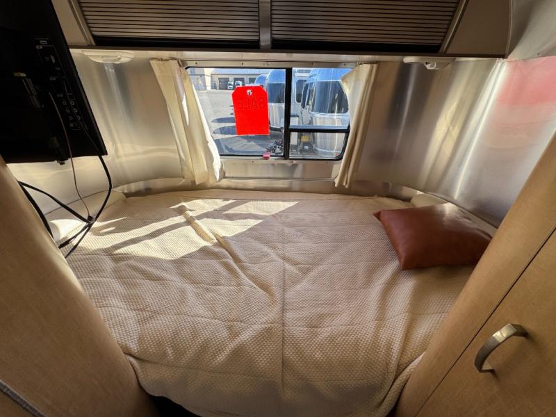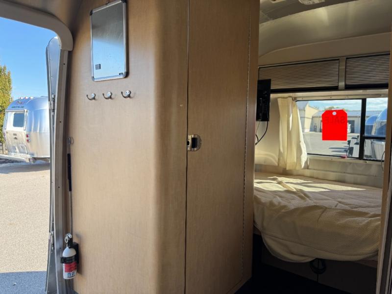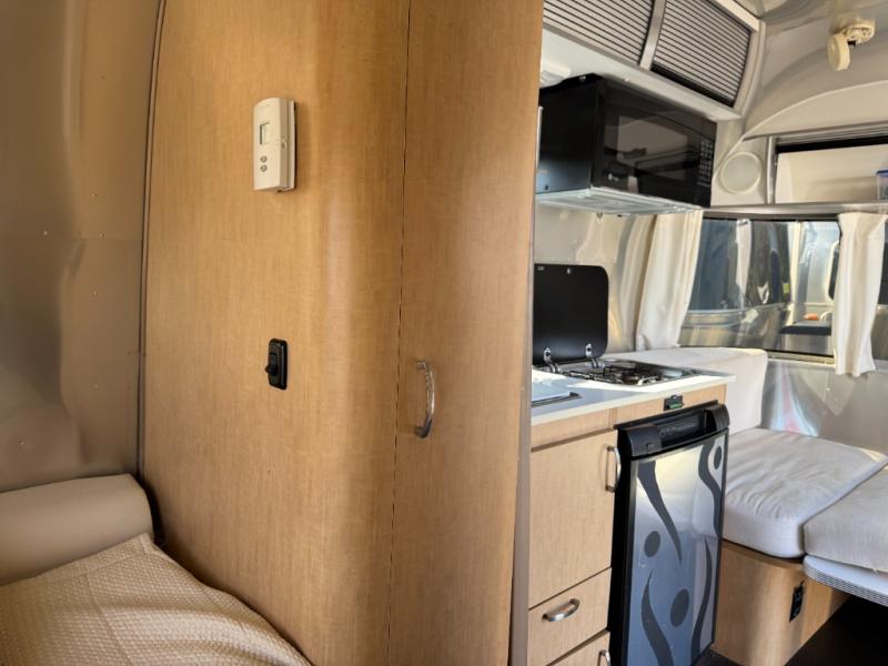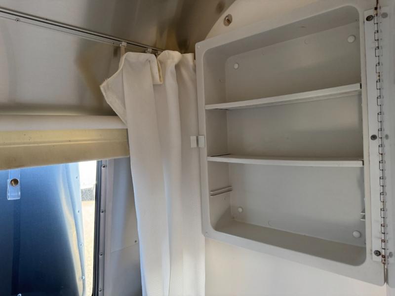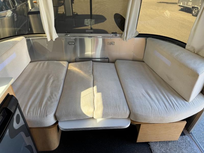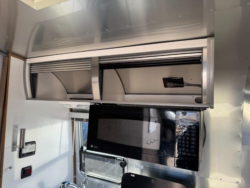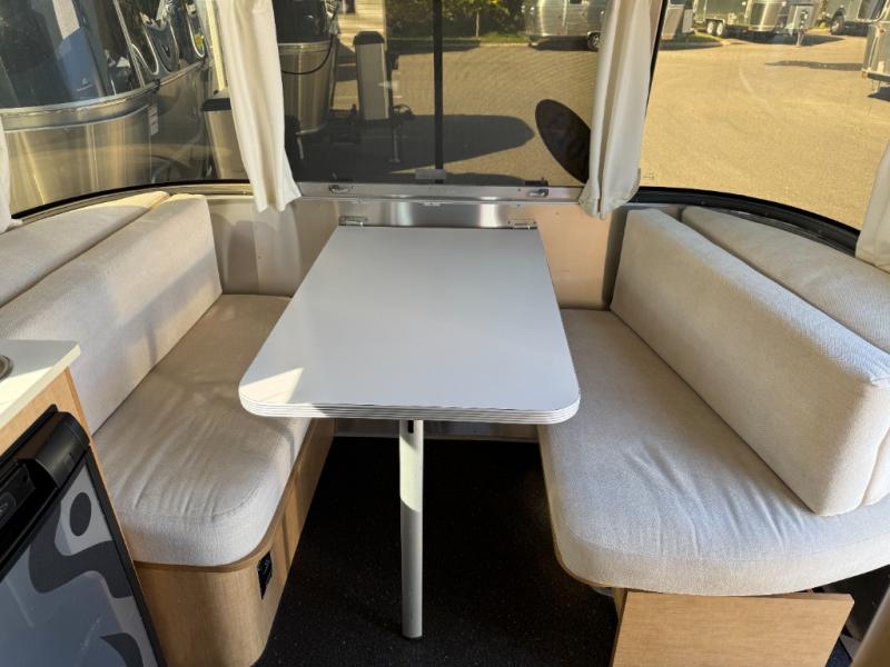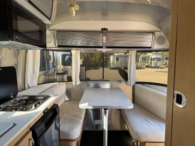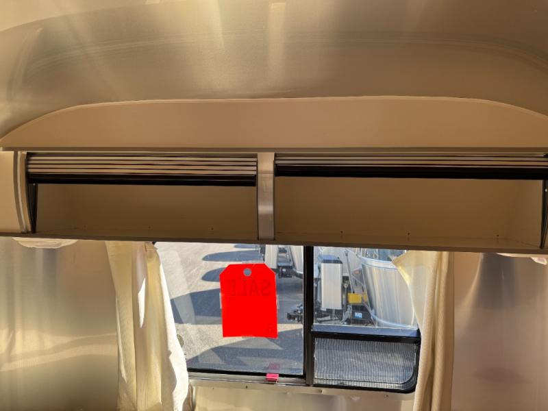 Brushed Aluminum Mini Blinds • Full Close Out Drapes at Panoramic & Bedroom Windows • Laminate Furniture & Countertops • Bright Aluminum Finish Interior Skin • Seamless Vinyl Flooring Throughout • Overhead Rooflockers w/ Tambour Doors • Satin Finish Hardware • Interior Grab Handle • Entrance Mat With Airstream Logo • Coat Hooks • Information Board.