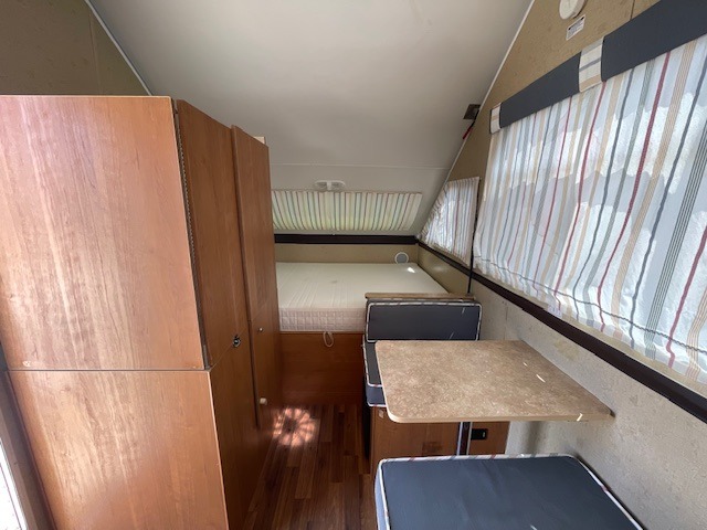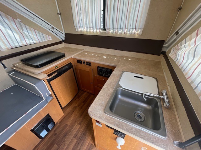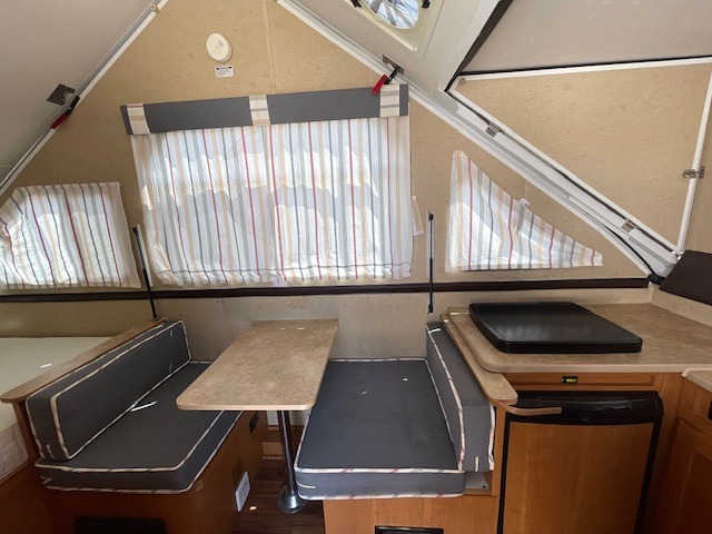 Folding Pop-Up Camper by Chalet, Permanent Bed w/Smart Storage System Underneath, Drawers, Dbl. Kitchen Sink, Galley Storage, Drawer, and Doors, Refrigerator, 2-Burner Range, Dinette Converts to Single Bed & Much More. Available Options May Include: Toilet/Shower.