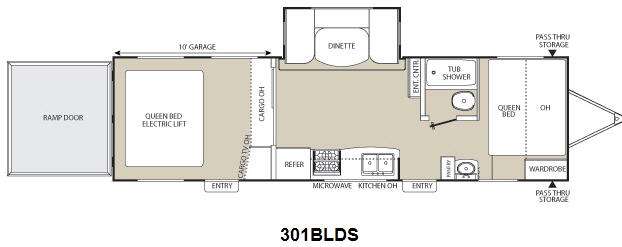 Freedom Express Toy Hauler Travel Trailer w/Rear Ramp Door to 10' Garage Space w/Queen Electric Lift Bed, Cargo Overhead Storage, Cargo TV, Side Entry in Cargo, Refrig., 3 Burner Range, Dbl. Kitchen Sink, U-Dinette Slideout, Ent. Center, Tub/Shower, Toilet & Separate Sink, Pantry, Front Queen Bed w/Overhead and Front Pass-Thru Storage and More!