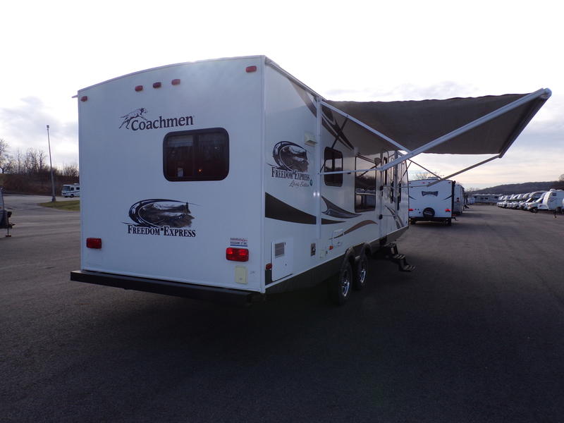Coachmen Freedom Express Deep Slide Travel Trailer w/Rear Kitchen Including: Refrig., Overhead Storage, Dbl. Sink, 3 Burner Range w/Microwave, 2 Chairs w/End Table Between, U-Dinette & Sofa Slideout w/Overhead Storage Above Sofa, Ent. Center, Side Aisle Bath w/Angle Shower, Toilet & Sink, Dbl. Bath Entry, Front Queen Bed w/Wardrobes Both Sides, Pass-Thru Storage and Much More!