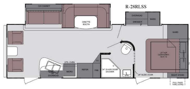 Radiance Lightweight Travel Trailer w/Rear Living Area Including: 2 Chairs w/Table Between, Sofa & U-Dinette Slide, Dbl. Kitchen Sink, 3 Burner Range, Refrig., Pantry/TV, Side Aisle Bath w/34" Glass Door Shower, Toilet & Sink, Front Lift -Up Queen Bed w/Wardrobe & Nightstand, Private Bedroom Entry, Dresser & Wardrobe Slide w/Overhead Storage, Front Pass-Thru Storage and Much More!