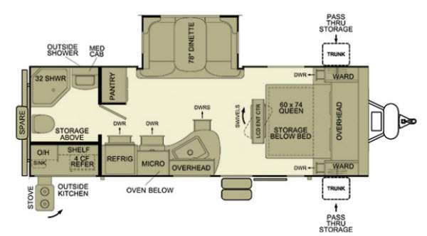Single Slide i-Go Evergreen Travel Trailer, Rear Bath w/Toilet, Shower, Lav., Med. Cab., Pantry, Dinette Slide, Swivel Entertainment Center, Queen Bed w/Storage Below Bed, Dbl. Wardrobes, Kitchen Sink, Microwave, Oven, Range, Refrigerator, Pull-Out Drawers, Overhead Cabinets Throughout, Outside Kitchen w/Refrigerator, Sink, 2-Burners, Pass Thru Storage, Outside Shower & Much More.