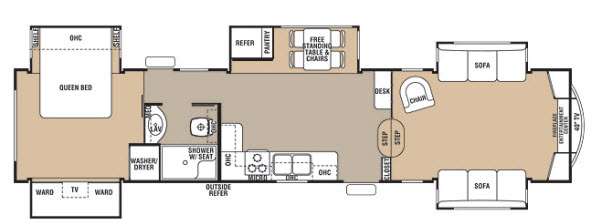 Quad Slide Cedar Creek Fifth Wheel, Rear Queen Bed w/Shelves Slide, Dbl. Wardrobes/TV Slide, Washer/Dryer, Lav., Med. Cab., Shower w/Seat, Toilet, 3-Burner Range, Dbl. Kitchen Sink, Refrigerator/Pantry/Free-Standing Table & Chairs Slide, Desk, Closet, Step Up To Living Area, Lounge Chair, Sofa Slide, Fireplace, Entertainment Center w/40" TV, Sofa Slide, Outside Refrigerator, Overhead Cabinets Throughout & Much More.