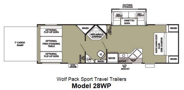 Separate Garage, Queen Murphy Bed, U-Shaped Dinette on SlideSingle Slide Cherokee Wolf Pack Sport Toy Hauler Travel Trailer, Rear Cargo Ramp, LCD TV Mount, Lav., Ward., Toilet, Ward., Neo-Angle Shower, Ent. Center, Dinette/Sofa Slide, Murphy Bed with Jack Knife Sofa, Dbl. Wardrobes, Dbl. Kitchen Sink, 3-Burner Range, Refrigerator, Outside LCD TV Mount, Overhead Cabinets Throughout & Much More. Available Options May Include: Rear Flip Up Sofa, Free Standing Table.