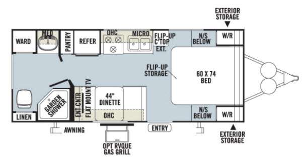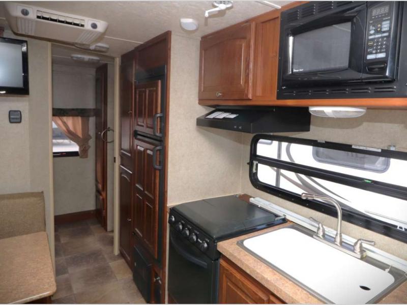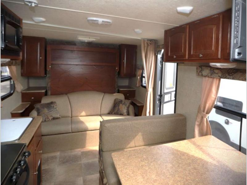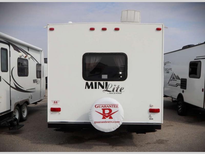 Rockwood Mini Lite Travel Trailer by Forest River w/Rear Bath, Garden Shower, Toilet, Linen, Wardrobe, Sink w/Overhead Storage, Pantry/Refrig., 3 Burner Range, Micro., Double Kitchen Sink, Flip Up TV Shelf in Bedroom, Murphy Bed w/Jack Knife Sofa, Nightstands Below Wardrobes, Booth Dinette, Entertainment Center & Storage Cabinet Above, TV Shelf, Exterior Front Storage, Awning and More.