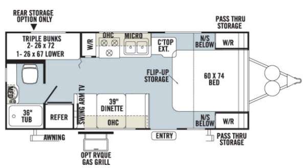 Rockwood Bunkhouse Mini Lite Travel Trailer w/Rear Corner Triple Bunks, Rear Corner Bath w/36" Tub, Vanity w/Sink & Med. Cabinet, Toilet, Refrigerator, Swing Arm TV, Dinette, Front Queen Bed w/Overhead Cabinets, Pass Thru Storage, Micro., Double Kitchen Sink, 3 Burner Range, Wardrobe, Lino. Throughout, Awning & More! Available Options May Include: Rear Storage, Murphy Bed.