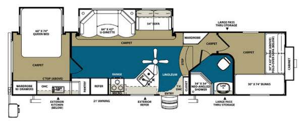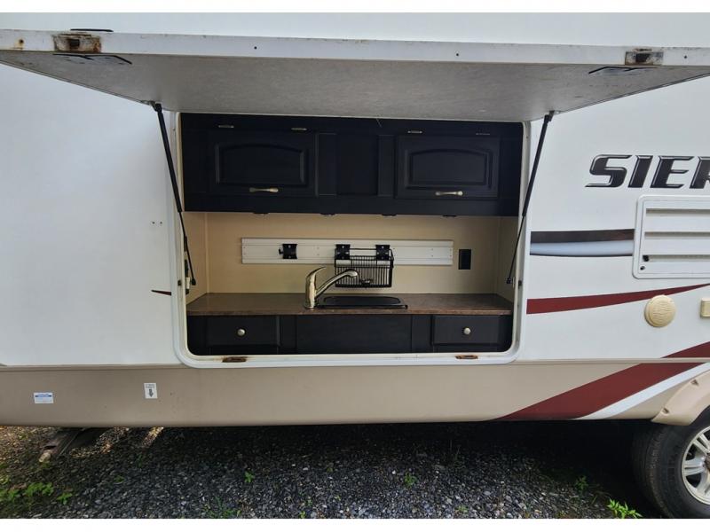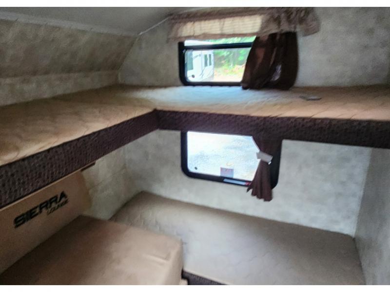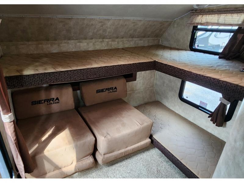 Double Slide Sierra Select Fifth Wheel, Rear Queen Bed Slide, Wardrobe w/Drawers, Pantry, Refrigerator, 3-Burner Range, Microwave, Dbl. Kitchen Sink, Ceiling Fan, TV, Closet, U-Dinette/Sofa Slide, Wardrobe, Step Up To Bed/Bath, Neo-Angle Shower, Lav., Toilet, Bunk Beds, Sofa w/Bunk Above, Overhead Cabinets Throughout, Large Pass Thru Storage, Ext. Kitchen w/Sink, Awning & Much More. Available Options May Include: Exterior Entertainment Center.