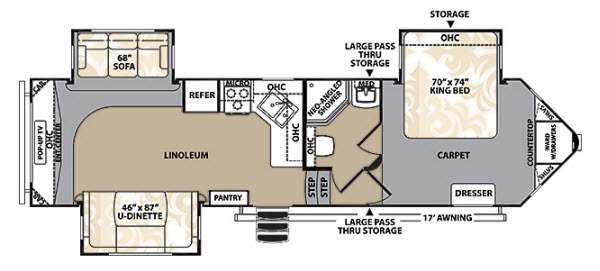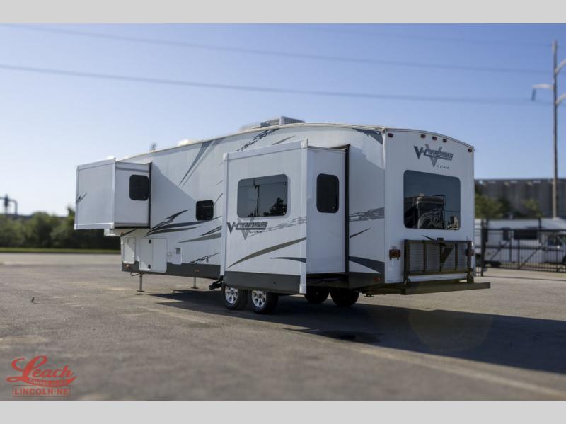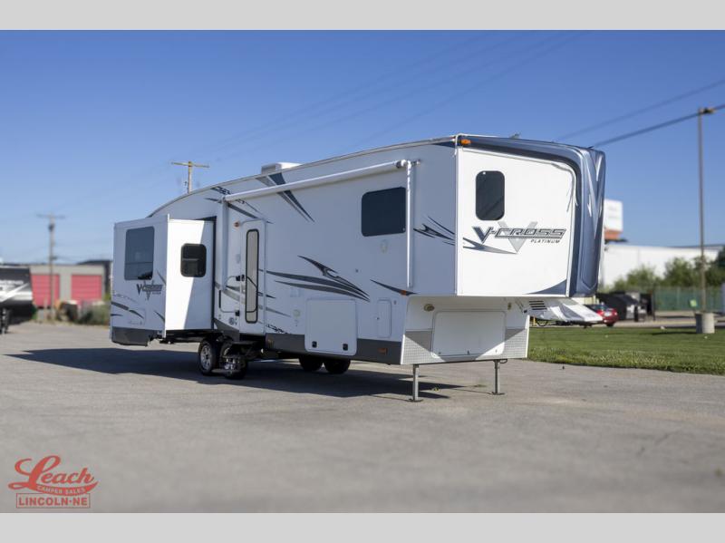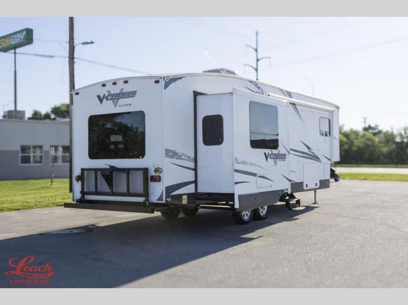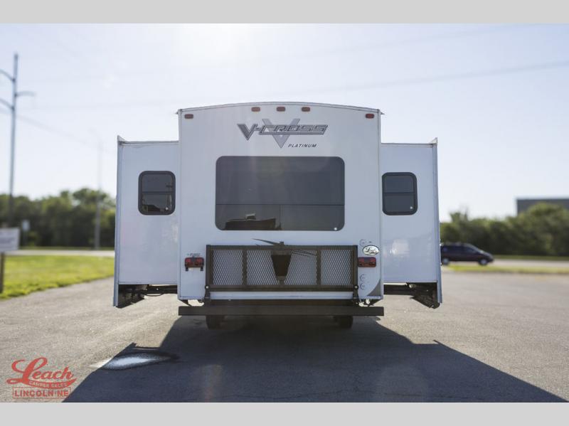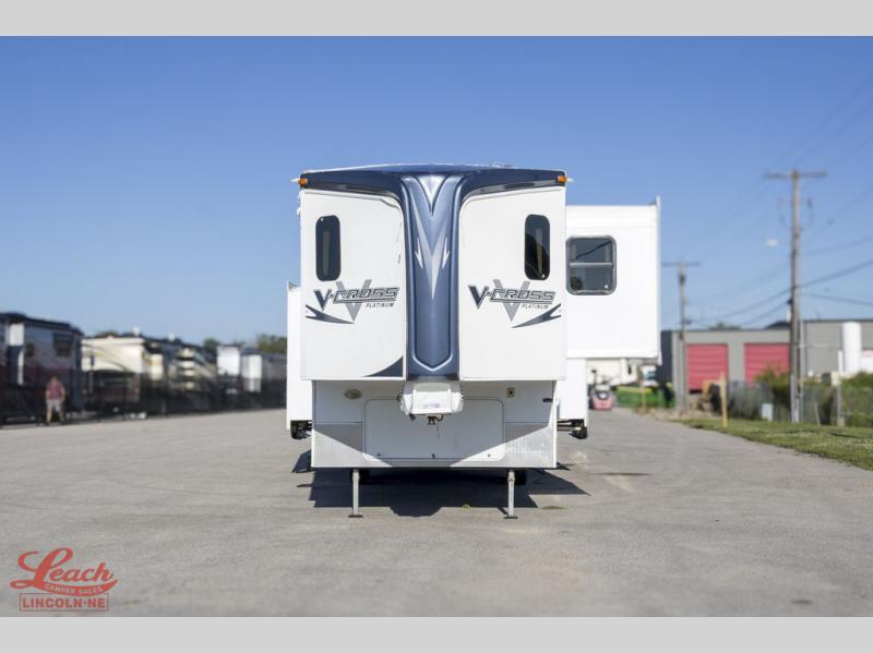 Triple Slide V Cross Platinum Fifth Wheel by Forest River, Rear Ent. Center w/Fireplace, Pop-Up TV & Overhead Cab., Sofa Slide, U-Shaped Dinette Slide, Refrigerator, 3-Burner Range, Microwave, Double Kitchen Sink, Step Up To Bed/Bath, Toilet, Shower, Lav., Med. Cab., King Bed Slide, Wardrobe w/Shelves, Countertop, Dresser, Overhead Cabinets Throughout, Ext. Storage & Much More.