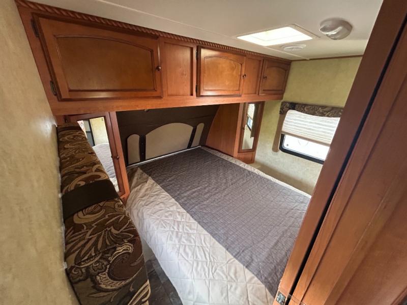 There is a comfy front king bed with shirt closets and overhead storage available for clothes and things. Plus there is additional storage with the front pass-thru compartment for outdoor camping gear and much more!