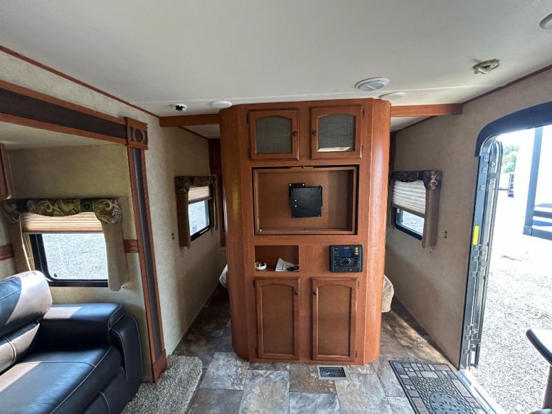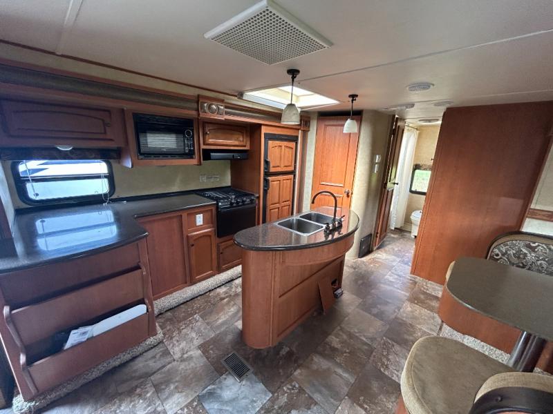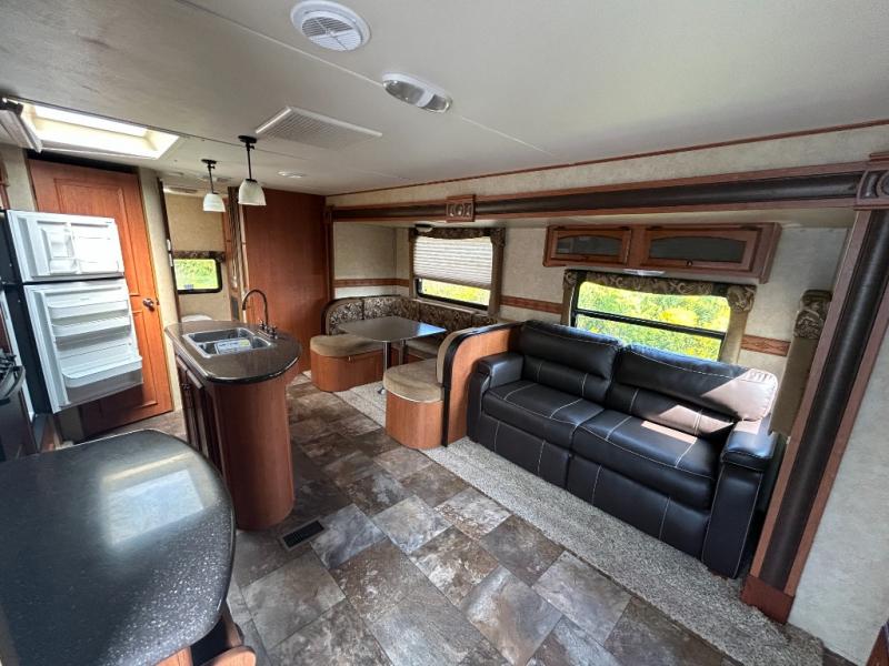 The outdoor kitchen provided is very convenient for those who enjoy cooking and eating outdoors. Step inside and see for yourself how great camping will be in this 29IKS Streamlite Champagne Series travel trailer!