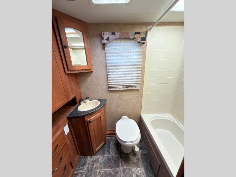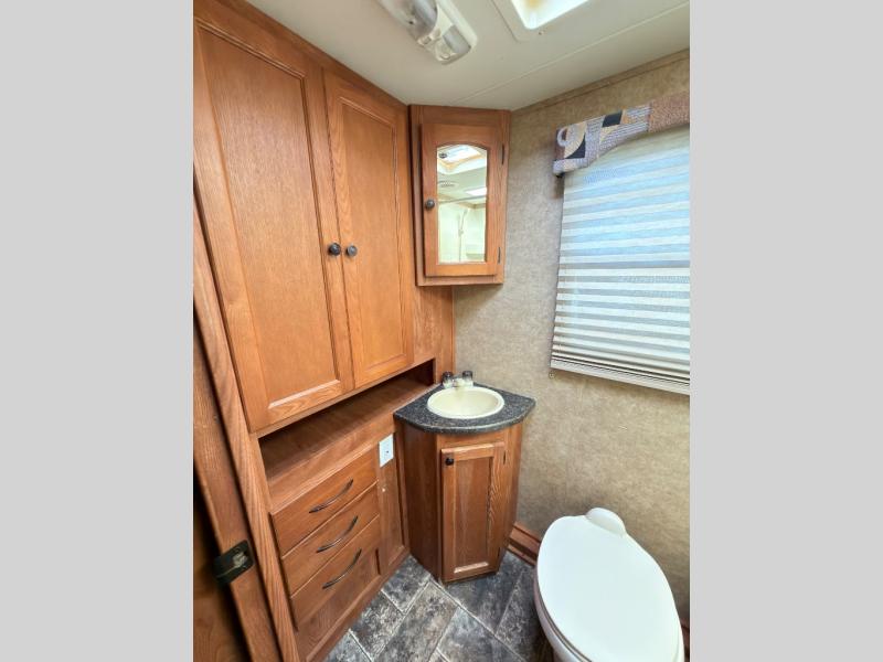 Single Slide North Trail Travel Trailer w/Full Rear Bath Including Linen Cabinet, Lav. & Neo-Angle Shower, Wardrobe & Toilet, Refrigerator, 3 Burner Range, Double Kitchen Sink, U-Shaped Dinette Slideout w/Overhead Storage Cabinet, Front Queen Bed w/Nightstands Below Shirt Closets, Pull-Out Drawer Below Bed and Much More.