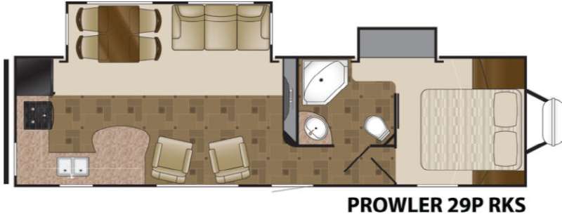 Prowler Travel Trailer w/Rear Kitchen Including Refrigerator, 3 Burner Range, Dbl. Kitchen Sink, Counter Space, Overhead Cabinets, Free Standing Dinette & Sofa Slideout, 2 Lounge Chairs, Ent. Center, Side Aisle Bath Including Angle Shower, Sink, Toilet, Entry From Hall & Bedroom, Front Queen Bed w/Closets Both Sides of Bed, Slideout Wardrobe and Much More!