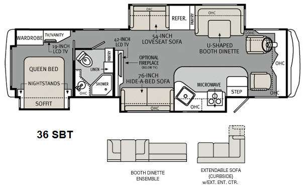 Vacationer Class A Coach by Holiday Rambler w/Rear Queen Bed Slide w/Nightstands, Closet/TV/Vanity w/19" LCD TV, Side Aisle Bath w/Angle Shower, Toilet, Vanity w/Sink, Linen Cabinet, Pantry, 42" LCD TV in Living Area, 54" Loveseat Sofa/Refrigerator/Pantry & U-Shaped Booth Dinette Slide, Overhead Cabinets Throughout, 3 Burner Range w/Microwave/Dbl. Kitchen Sink/76" Hide-A-Bed Sofa/End Table, Ford 22,000 lb. Chassis & More! Available Options May Include: Booth Dinette Ensemble, Extendable Sofa.