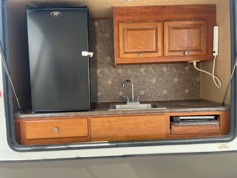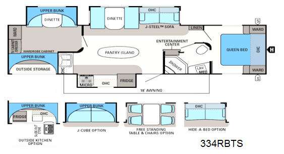 Eagle Bunkhouse Trailer w/Rear Booth Dinette Slide w/Bunk Above, Ward., TV Cabinet/Dresser, Ward. Cabinet w/Bunk Above, Booth Dinette & J-Steel Sofa Slide, Kitchen Island w/Pantry, Dbl. Sink, Overhead Cabinets, 3 Burner Range w/Micro. Above & Refrig. Plus Counter Space Slide, Ent. Center, Side Aisle Bath w/Angle Shower, Toilet & Sink, Dbl. Bath Entry, Front Queen Bed w/Wards. Both Sides, Hall Linen Cabinet, & More! Avail. Options May Incl.: Outside Kitchen, H-A-B, J-Cube, Free Standing Dinette.